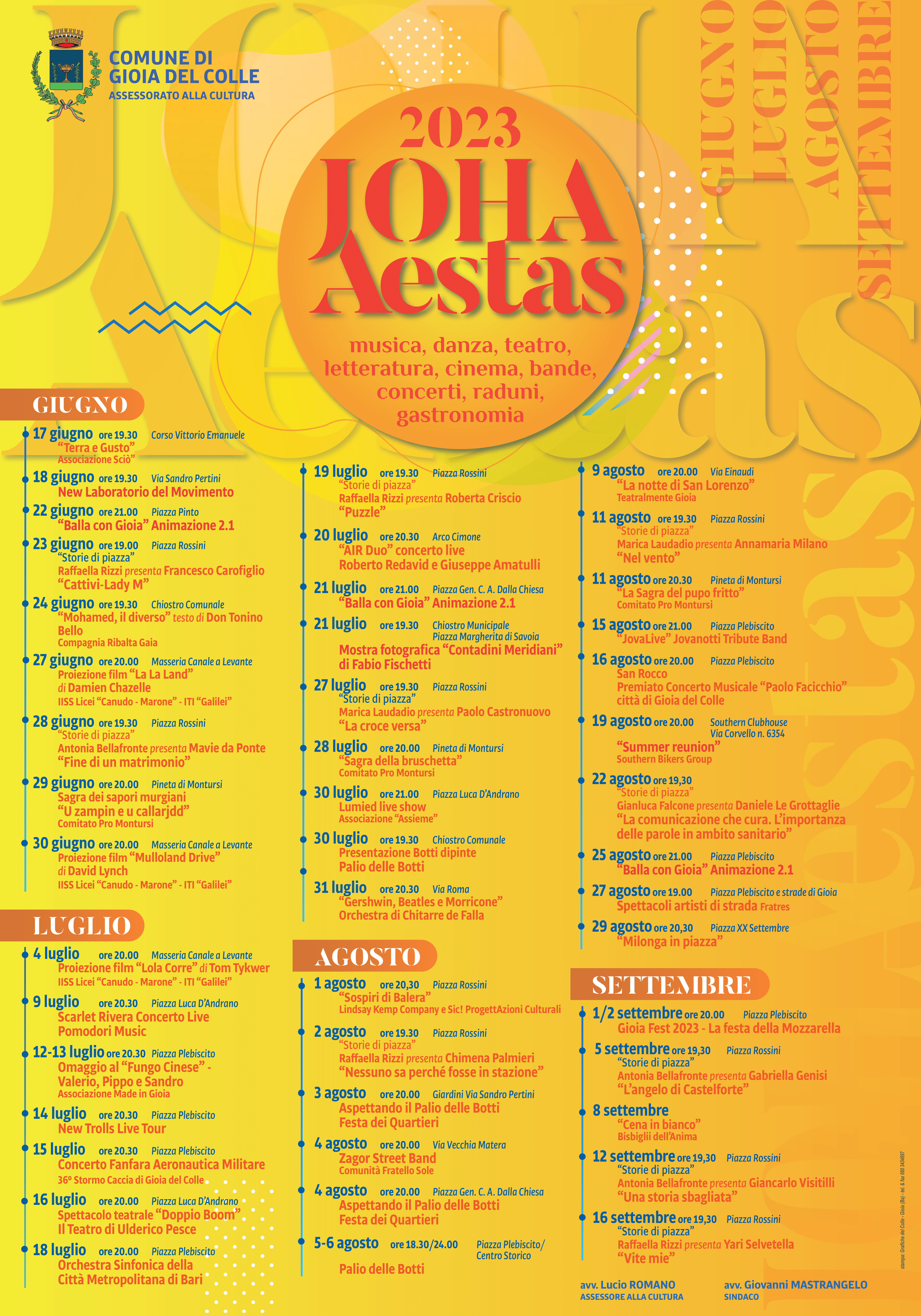 “Il cartellone di eventi targato Joha Aestas 2023 è pronto ad allietare le sere d'estate dei gioiesi con una felice commistione di variegate proposte culturali e occasioni di piacevole intrattenimento – dichiara l'assessore alla Cultura e al Turismo Lucio Romano –. Ci attendono oltre quaranta appuntamenti, dunque, da vivere insieme in un clima di serenità, spensieratezza e reciproca complicità".