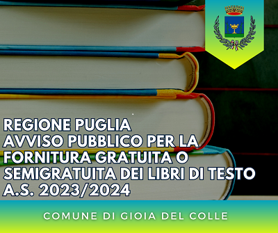 In riferimento al contributo per la Fornitura dei Libri di testo delle scuole secondarie di I e II grado per l'a.s. 2023/24, si ricorda che la Regione Puglia – Servizio Sistema dell’Istruzione e del Diritto allo Studio - con atto n. 175 dell’20 giugno 2023, ha comunicato l’avvenuto stanziamento dei fondi per la fornitura gratuita o semigratuita dei libri di testo per l’a.s. 2023/2024.