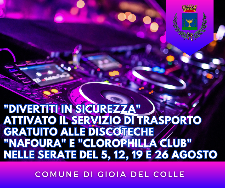 Con deliberazione di Giunta n. 176 del 20 giugno 2023 l’Amministrazione comunale ha deciso di attivare un servizio di trasporto gratuito che consentirà ai giovani residenti a Gioia del Colle di raggiungere in autobus le discoteche “Nafoura” e “Clorophilla Club” di Castellaneta nelle serate del 5, 12, 19 e 26 agosto 2023.