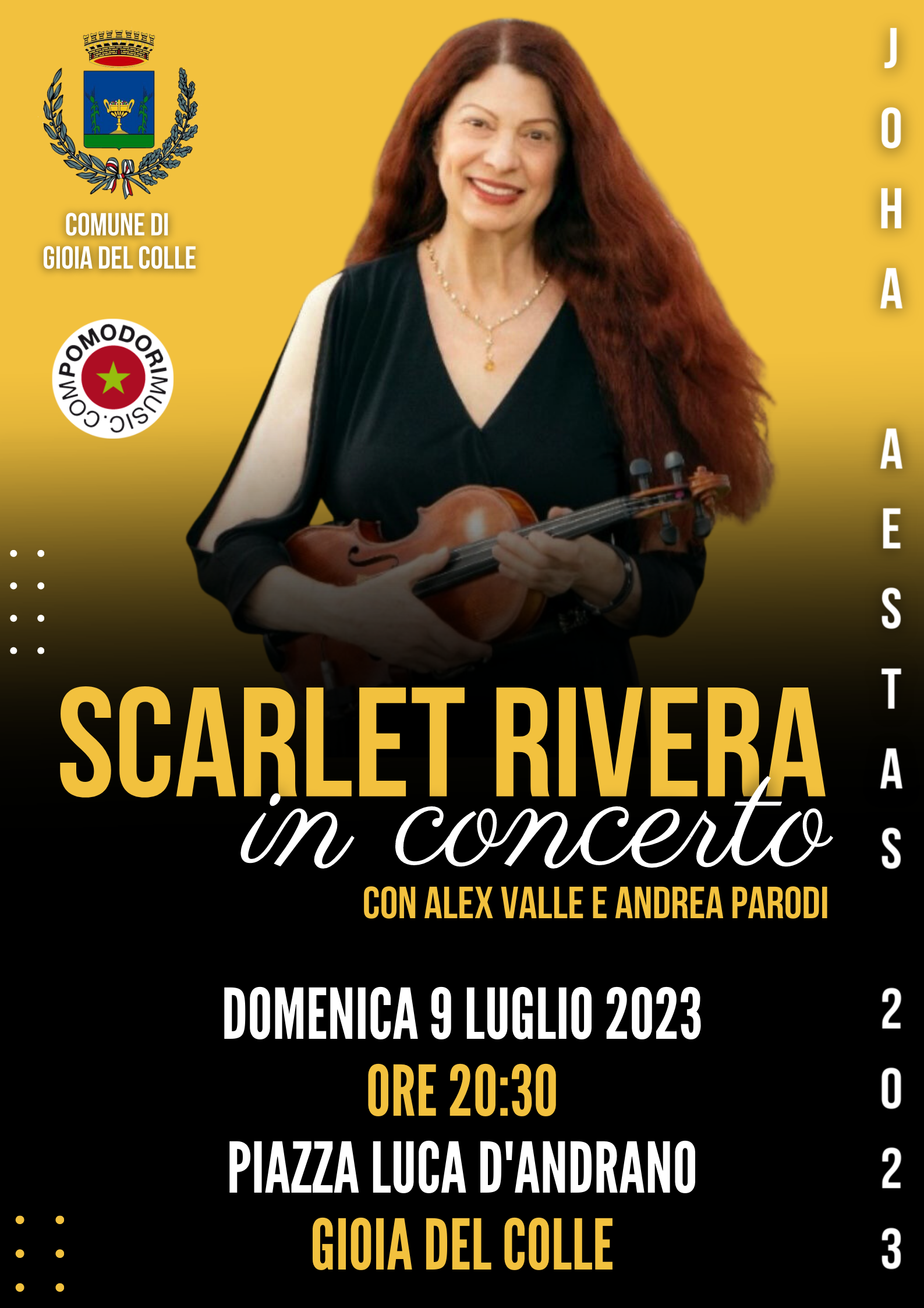 “Siamo onorati di ospitare nella nostra città l’insigne musicista Scarlet Rivera - dichiara l’assessore alla Cultura e al Turismo Lucio Romano -. Domenica avremo l’onore di ascoltare dal vivo una serie di performances di un'icona della musica internazionale, accompagnata dal grande chitarrista Alex Valle e dall’eccellente cantautore Andrea Parodi. A loro rivolgo il mio ringraziamento per aver scelto Gioia del Colle come tappa privilegiata del tour 2023”.