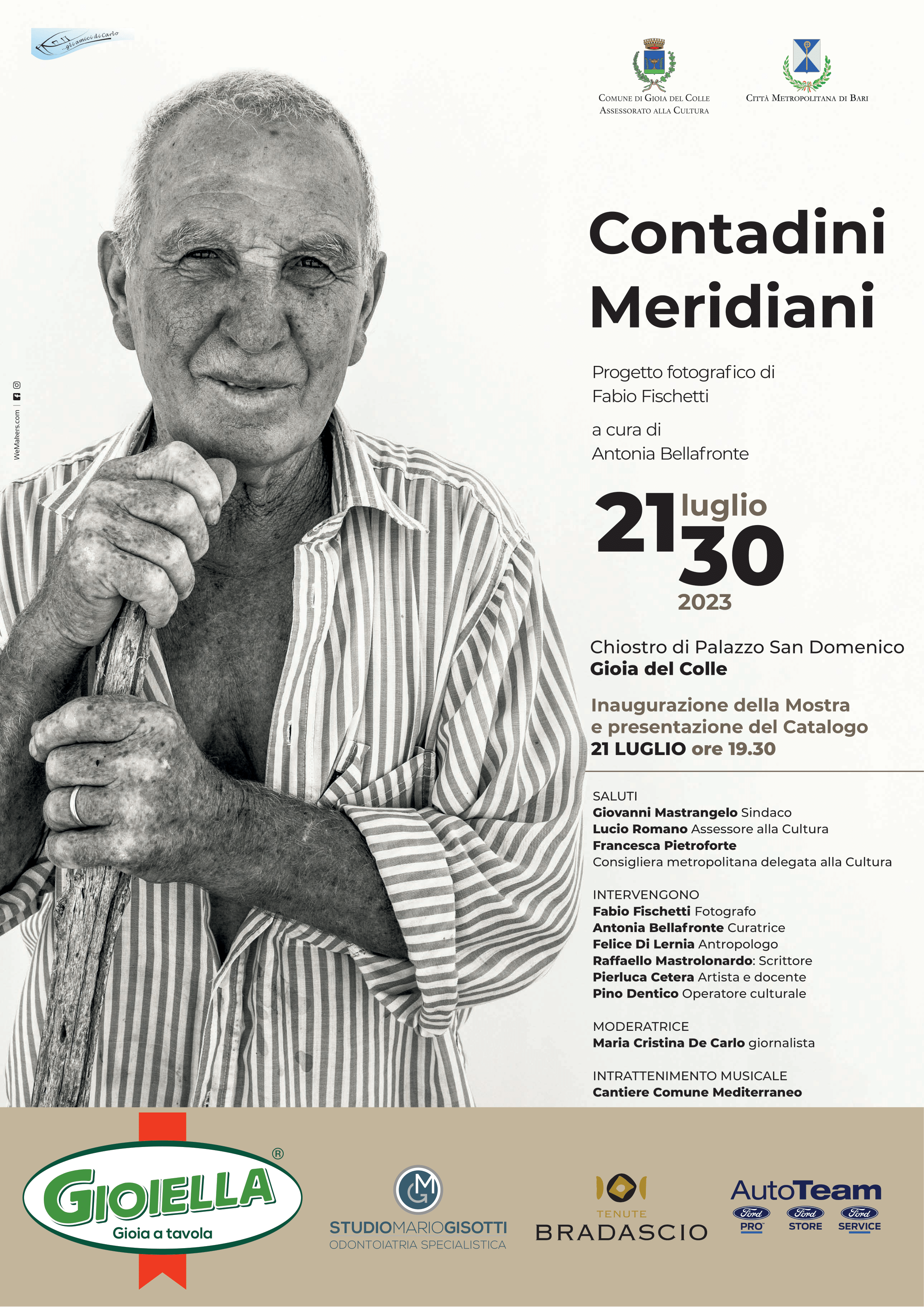 Sarà presentato venerdì 21 luglio, alle ore 19:30, nel chiostro di Palazzo San Domenico, il nuovo progetto fotografico di Fabio Fischetti dal titolo “Contadini Meridiani”, patrocinato dalla Città Metropolitana di Bari e dal comune di Gioia del Colle e curato da Antonia Bellafronte.