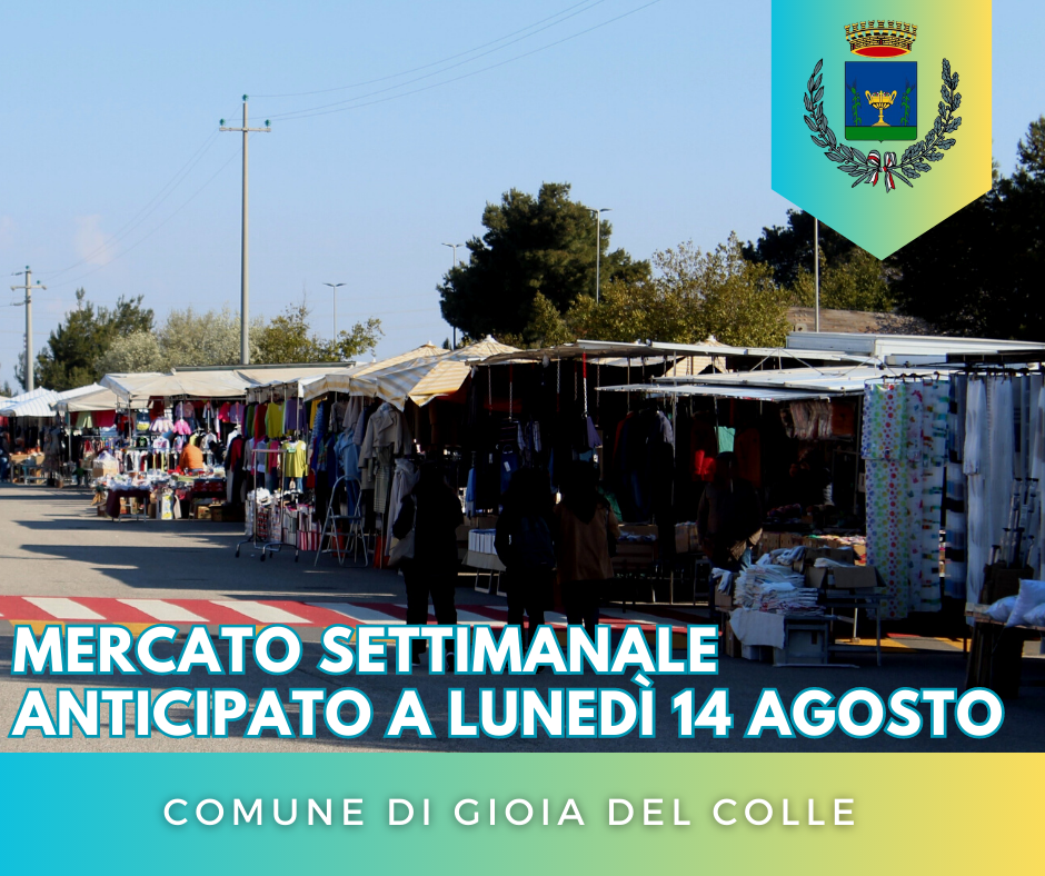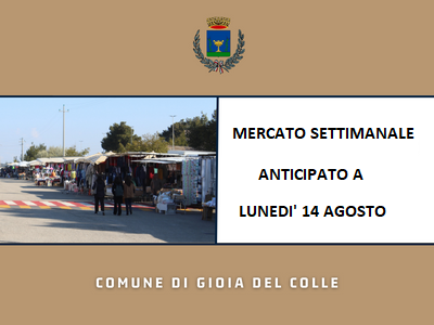 Si comunica che, con Ordinanza Sindacale n.55 del 02.08.2023, la giornata del mercato settimanale di martedì 15.08.2023, è stata anticipata a lunedì 14.08.2023 data la concomitanza con la festività dell’Assunzione di Maria che si celebra il 15 agosto.