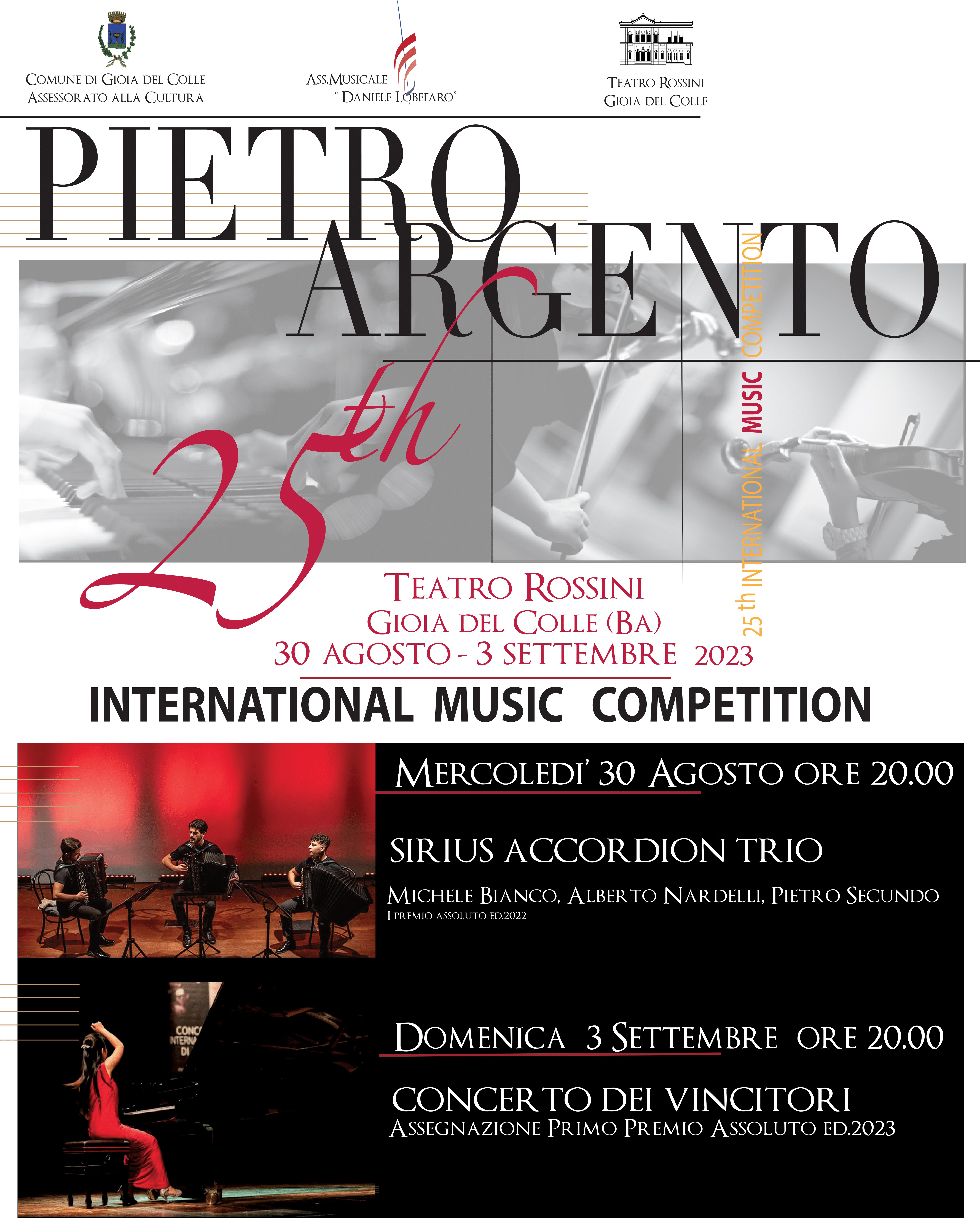 C’è grande fermento a Gioia del Colle per l’imminente inizio della XXV edizione del Concorso internazionale di musica “Pietro Argento”, la prestigiosa kermesse organizzata dall’associazione “Daniele Lobefaro” che, dal 30 agosto al 3 settembre, porterà sul palco del Teatro comunale Rossini artisti di talento provenienti dalle più rinomate scuole musicali del mondo.