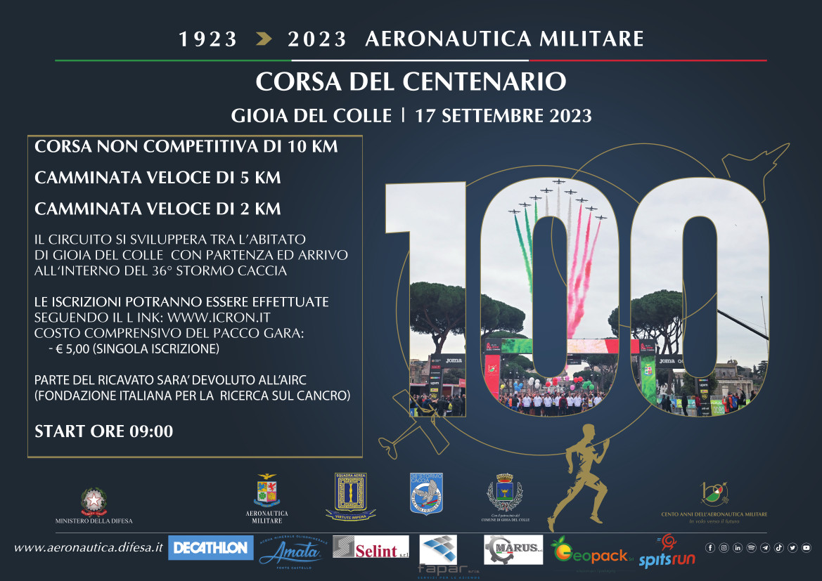 Nell'ambito delle celebrazioni del centenario della costituzione dell’Aeronautica Militare, domenica 17 settembre 2023 la base del 36° Stormo Caccia A.M. di Gioia del Colle aprirà le porte agli appassionati del running per la “Corsa del Centenario” (raduno ore 7:30 - partenza ore 9:00), manifestazione patrocinata dal comune di Gioia del Colle.