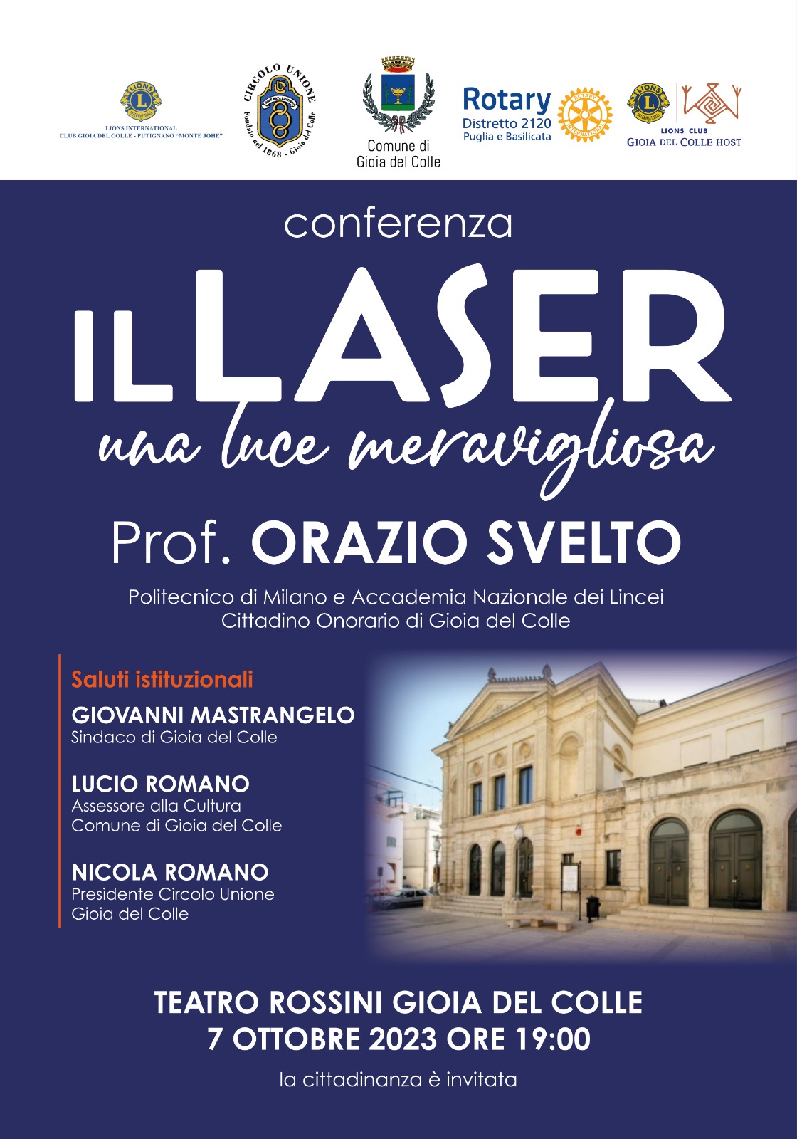 Domani, sabato 7 ottobre 2023, nel teatro comunale Rossini, a partire dalle ore 19:00, il prof. Orazio Svelto, cittadino onorario di Gioia del Colle, terrà una conferenza dal titolo “Laser, una luce meravigliosa”.