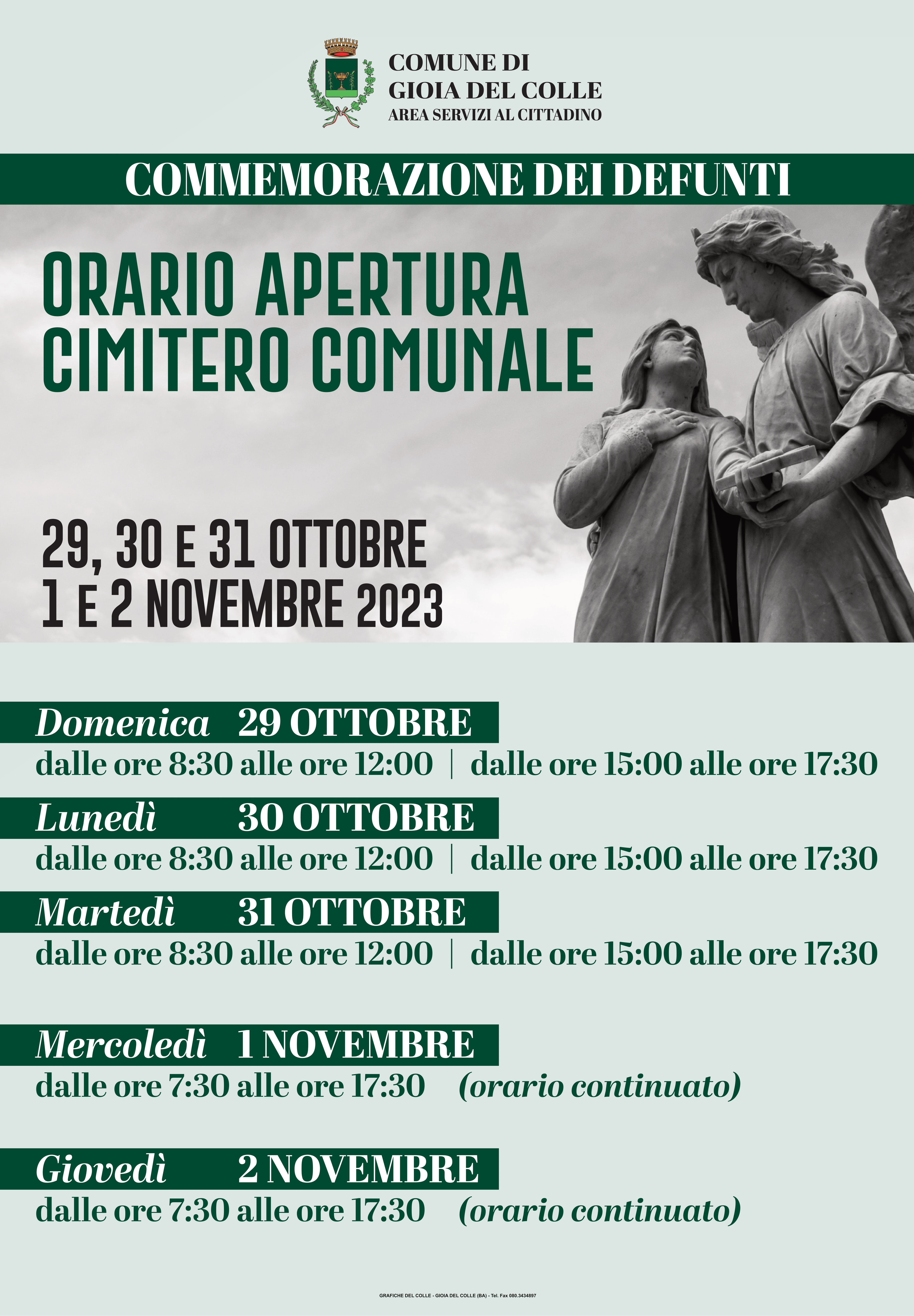 Si informa la cittadinanza che, in occasione della ricorrenza della commemorazione dei defunti, il cimitero comunale osserverā i seguenti orari di apertura al pubblico: