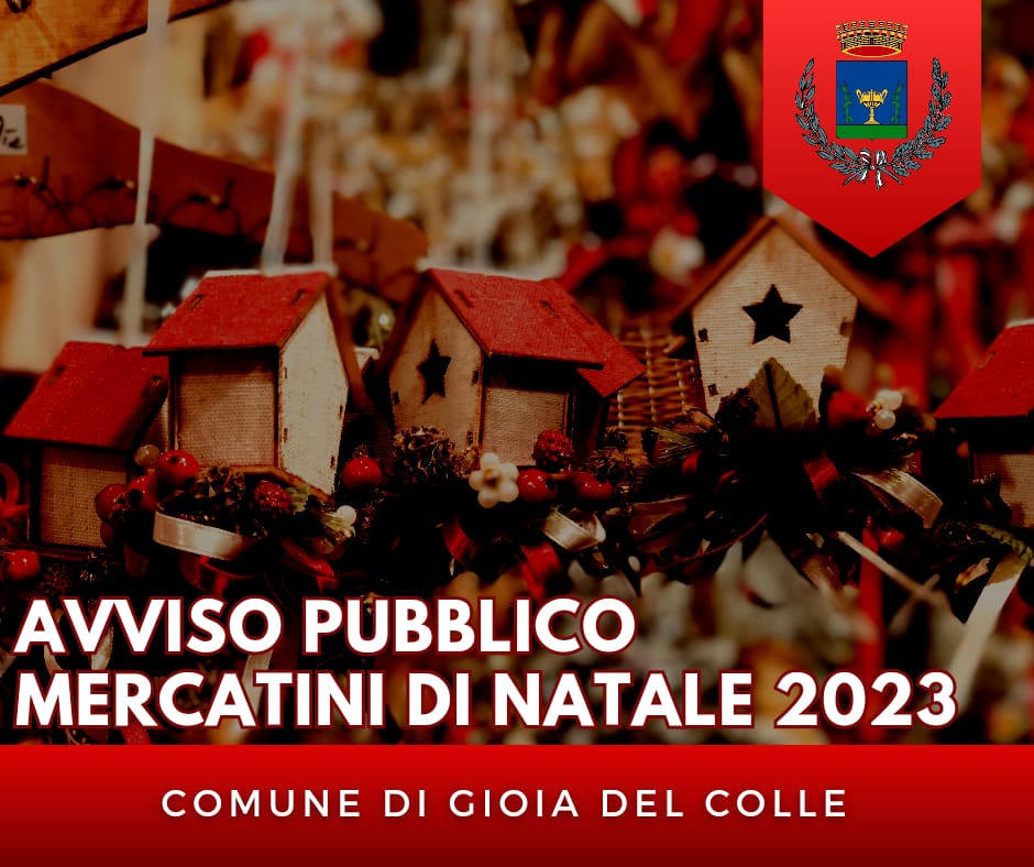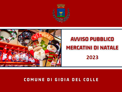 Si informano gli operatori commerciali interessati che, per l’anno 2023, i tradizionali “MERCATINI DI NATALE”, previsti dal “PIANO COMUNALE DEL COMMERCIO SU AREE PUBBLCHE” approvato con deliberazione del Consiglio Comunale n. 37/2021, si svolgeranno nelle seguenti domeniche: 03 – 10 – 17 dicembre in via Ricciotto Canudo, come da Ordinanza del Responsabile Area Urbanistica – Suap n. 80 del 27.10.2023 ;