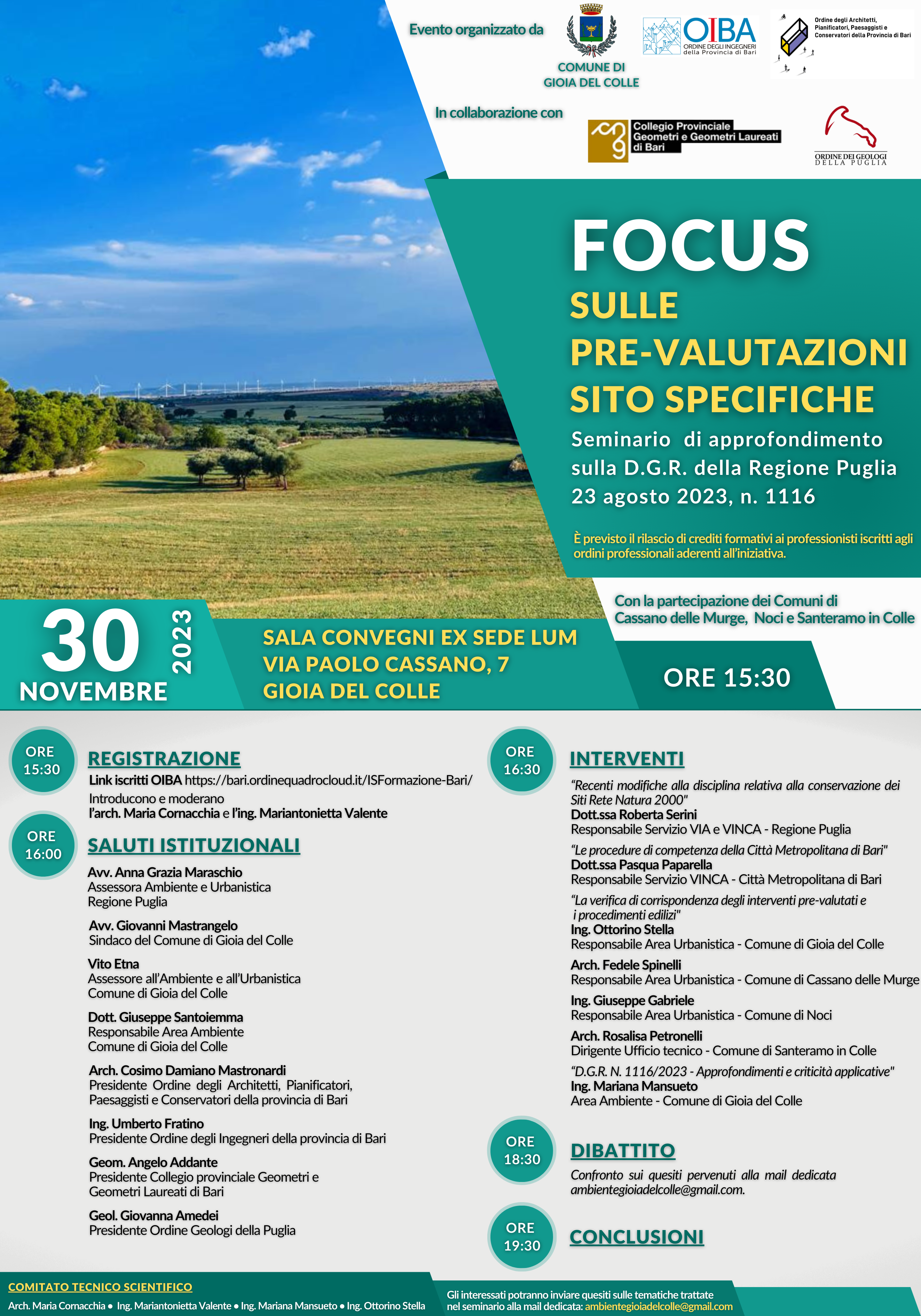 Giovedì 30 novembre, a partire dalle ore 15:30, nella sala Convegni dell’ex sed LUM (via Paolo Cassano 7, in Gioia del Colle) si terrà l’evento “Focus sulle pre-valutazioni sito specifiche”, seminario di formazione e approfondimento sulla D.G.R. della Regione Puglia 23 agosto 2023, n. 1116.