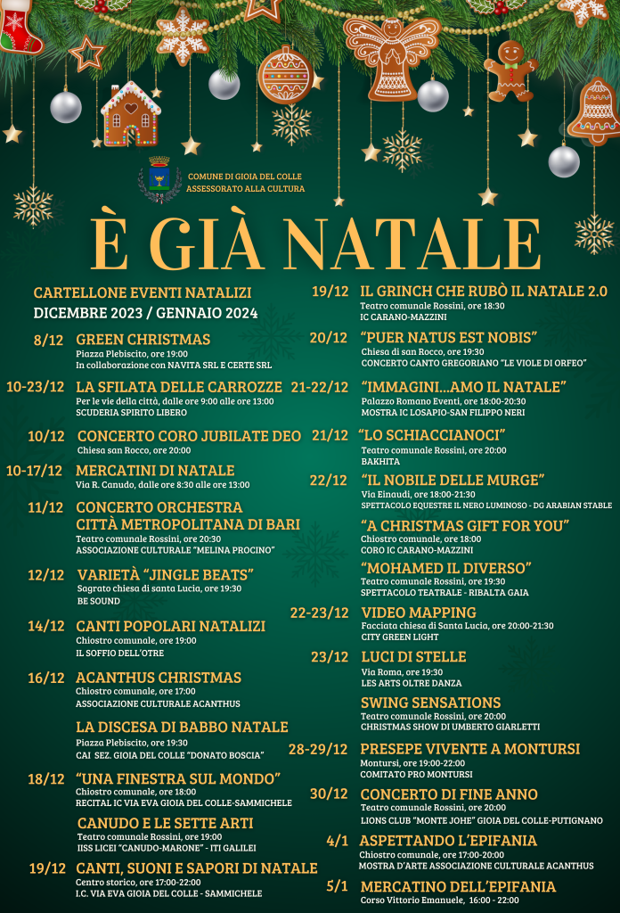 La settimana dall’11 al 17 dicembre sarà all’insegna della musica, dell’arte e dell’intrattenimento con il concerto “Natale” dell’orchestra della Città metropolitana di Bari al teatro Rossini (organizzato dall’associazione culturale Melina Procino nella serata di lunedì 11 dicembre), il varietà “Jingle Beats” della scuola di musica e teatro Be Sound sul sagrato della chiesa di Santa Lucia (martedì 12 dicembre, ore 19:30), i canti popolari natalizi nel chiostro comunale (giovedì 14 dicembre, ore 19:00, a cura de “Il soffio dell’otre”), l’evento “Acanthus Christmas” della nuova associazione culturale gioiese sempre nel chiostro comunale (sabato 16 dicembre, ore 17:00) e, infine, con la discesa di Babbo Natale (sabato 16 dicembre, ore 19:30, a cura del CAI sez. Gioia del Colle “Donato Boscia”) e la parata di elfi e supereroi (domenica 17 dicembre, ore 10:30) in piazza Plebiscito.