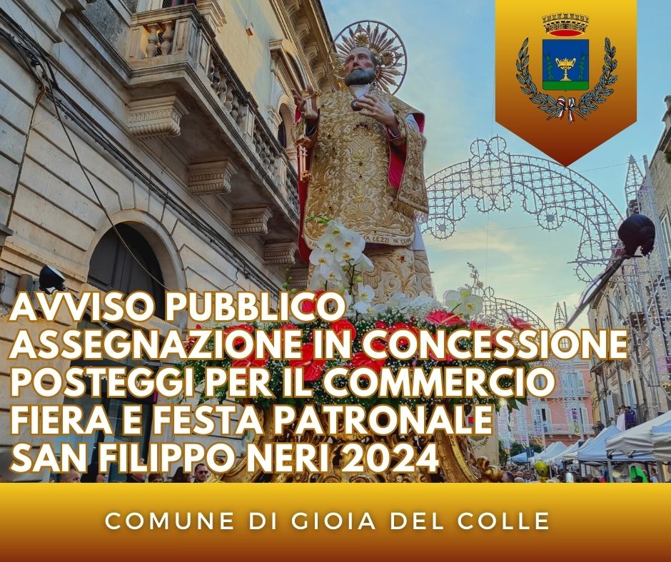 E’ indetta la procedura per l’assegnazione delle concessioni di posteggio per il commercio su aree pubbliche in occasione della Fiera in onore del Santo Patrono “San Filippo Neri”, che si svolgerà il 19 maggio 2024 e in occasione della Festa Patronale di San Filippo Neri, che si svolgerà nei giorni 25 – 26 – 27 maggio 2024.