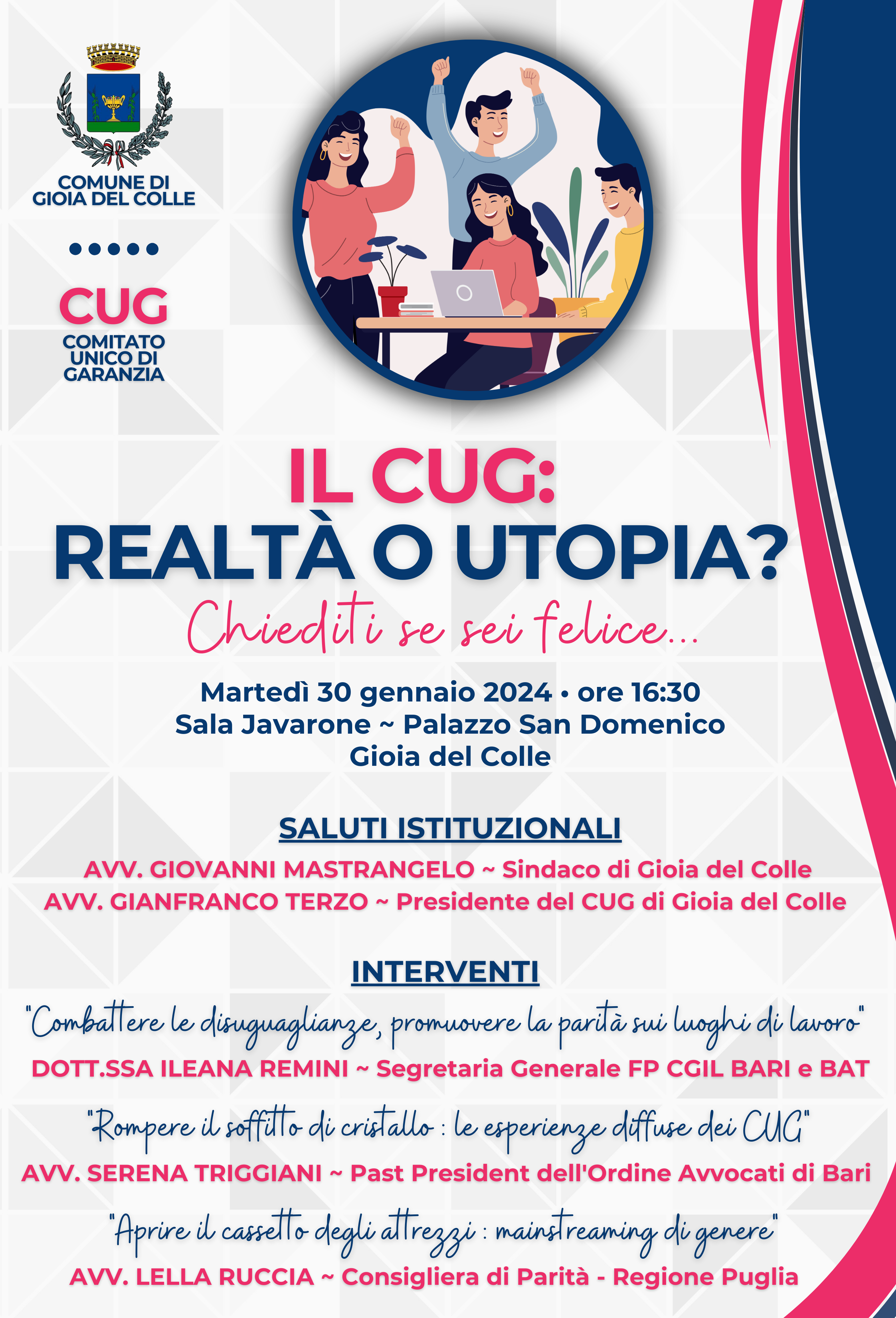 Martedì 30 gennaio, alle ore 16:30, nella sala Javarone di Palazzo San Domenico (sede del Comune di Gioia del Colle) si terrà l’evento “Il CUG: realtà o utopia? Chiediti se sei felice...", nel corso del quale sarà presentato il nuovo Comitato Unico di Garanzia di Gioia del Colle (2023-2026), organismo interno all'Amministrazione comunale avente la funzione di garantire il benessere lavorativo dei dipendenti e condizioni di parità sui luoghi di lavoro.