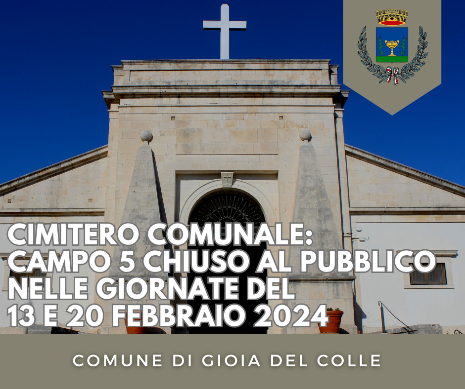 Si informa la cittadinanza che, nelle giornate del 13 e 20 febbraio 2024, il campo 5 sarà chiuso al pubblico per lo svolgimento di operazioni di esumazione massiva.