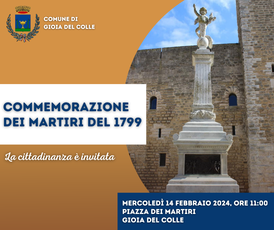 Mercoledì 14 febbraio, alle ore 11:00, in piazza dei Martiri si terrà la commemorazione dei gioiesi Giuseppe Del Re, Biagio Del Re, Donatantonio Losito, Filippo Petrera, Giuseppe Calabrese e Nicola Basile che, nel lontano febbraio 1799, sacrificarono la propria vita in difesa dei nobili valori della libertà e della giustizia.