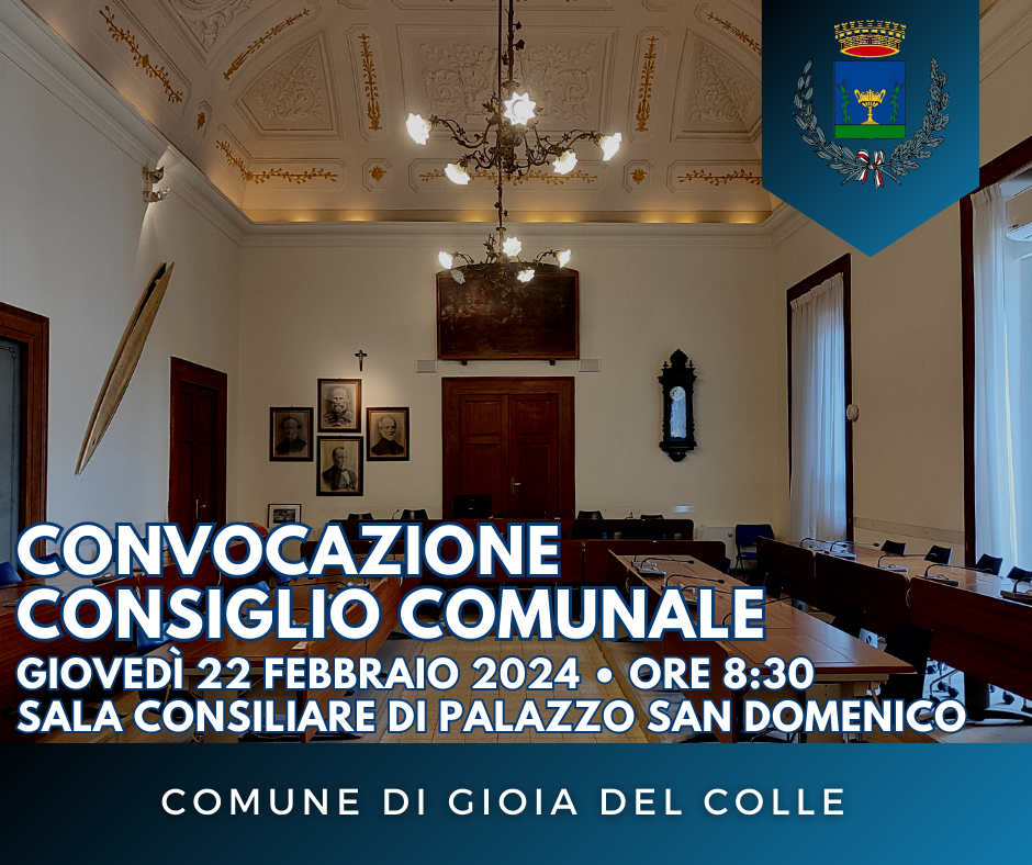 il Consiglio comunale di Gioia del Colle in seduta ordinaria ed in 1^ convocazione per il giorno 22 febbraio 2024, alle ore 8:30 e, nel caso non si raggiunga il numero legale, in 2^ convocazione per il giorno 23 febbraio 2024, alle ore 9:30, nella sala consiliare di Palazzo San Domenico, per la trattazione dei seguenti argomenti: