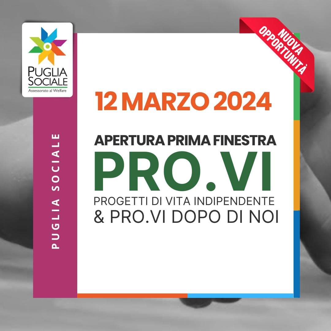A partire dalle ore 12:00 di martedì 12 marzo 2024 sarà possibile presentare domanda di contributo nell'ambito dell'avviso pubblico della Regione Puglia (approvato con determinazione dirigenziale n. 206 del 23.02.2024) per la selezione di Progetti di Vita Indipendente (PRO.V.I.) e Progetti di Vita Indipendente Dopo di Noi (PRO.V.I. DOPO DI NOI).