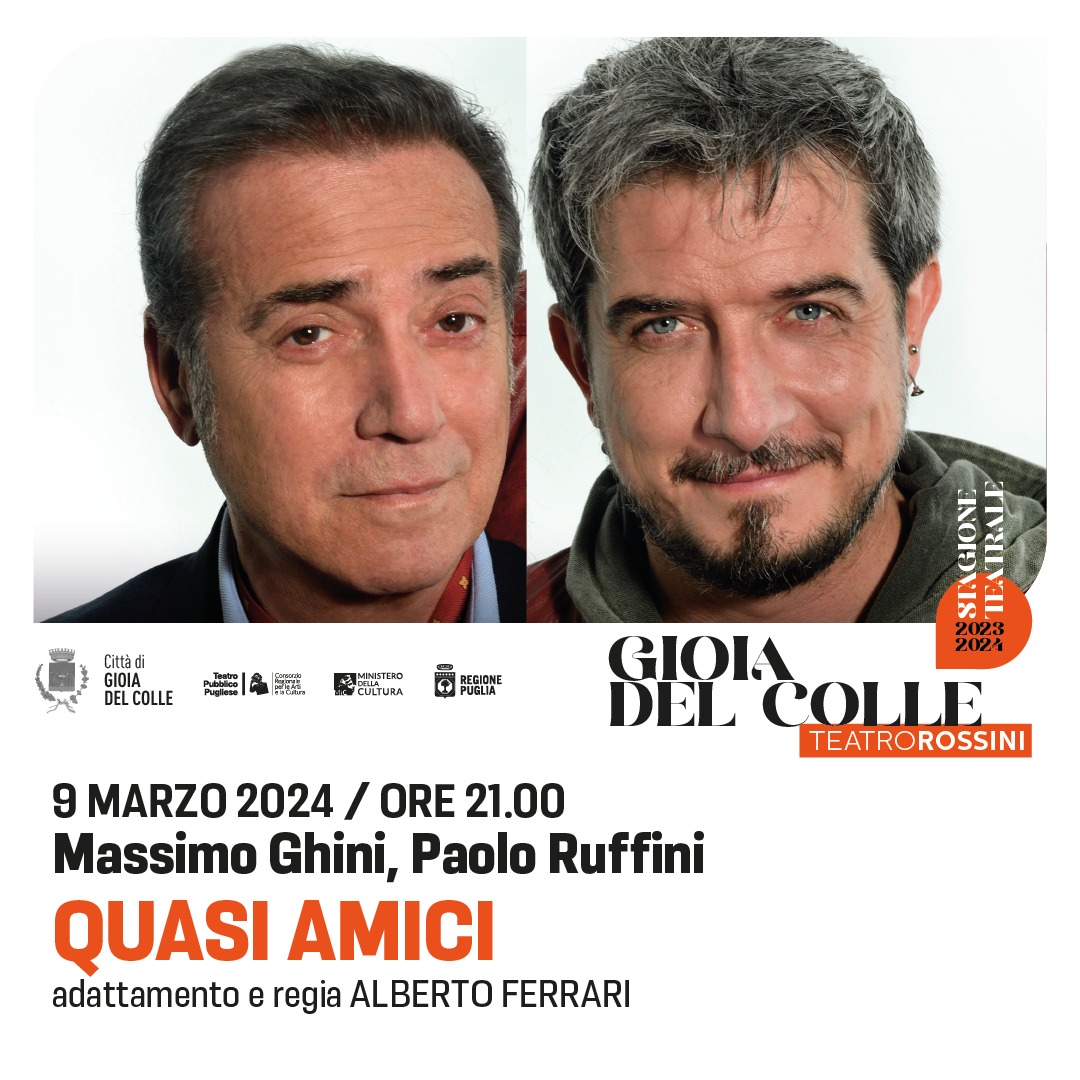 Ai successi di pubblico per gli spettacoli "40 e sto" di Andrea Delogu, "La sorella migliore" con Vanessa Scalera, "In ogni vita la pioggia deve cadere" con Leo Gullotta e Fabio Grossi, "Chi è io?" con Francesco Pannofino, si aggiunge il “tutto esaurito” per il penultimo appuntamento di prosa “Quasi amici” che, diretto dal regista Alberto Ferrari e tratto dal celebre film di Eric Toledano e Olivier Nakache, andrà in scena sabato 9 marzo 2024, alle ore 21:00.