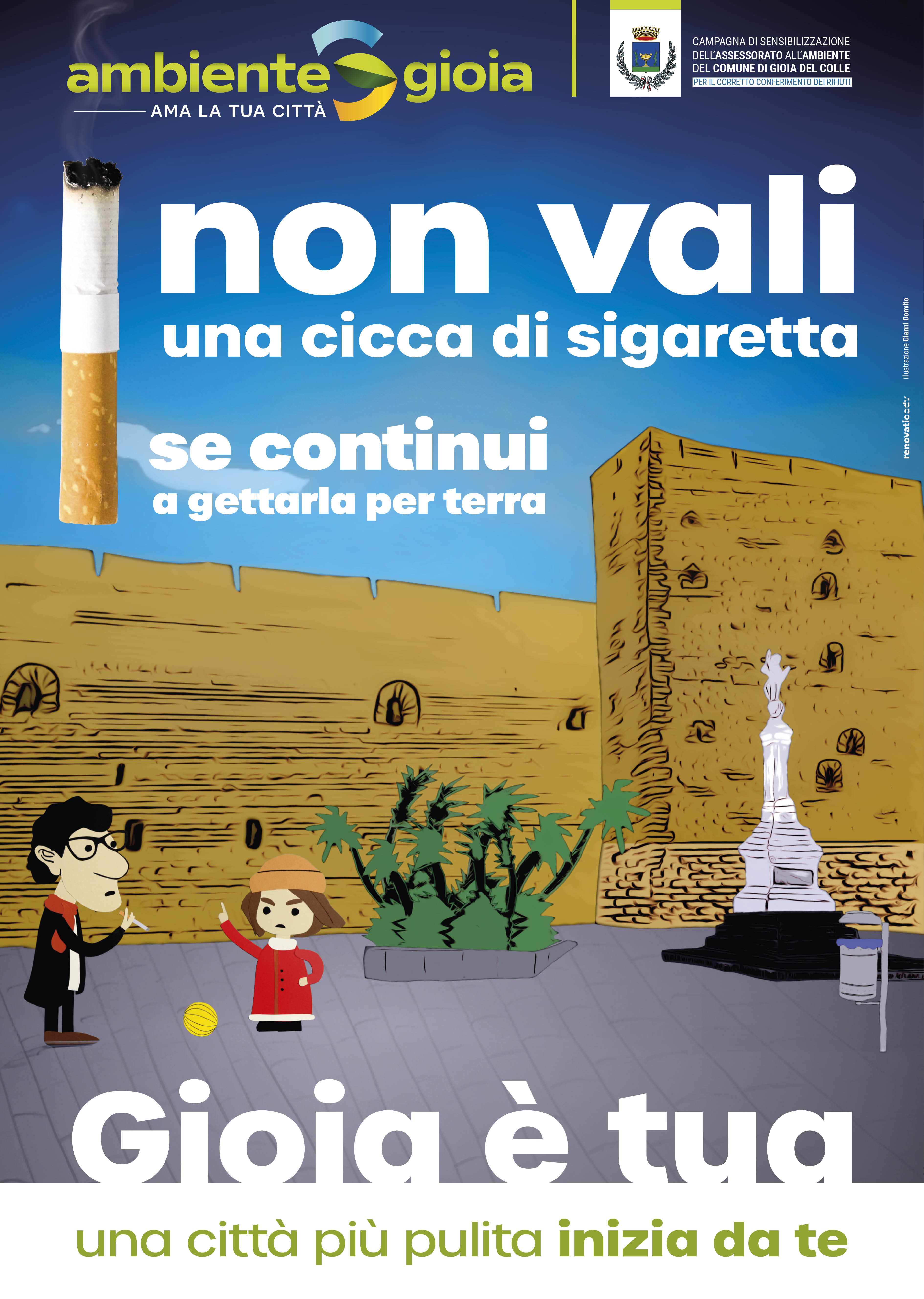 Saranno le illustrazioni del gioiese Gianni Donvito a caratterizzare la nuova campagna di sensibilizzazione che, nello specifico, punterà sulla promozione di comportamenti corretti per contrastare l'abbandono di mozziconi di sigarette e delle deiezioni canine e, infine, l'utilizzo improprio dei cestini gettacarte.