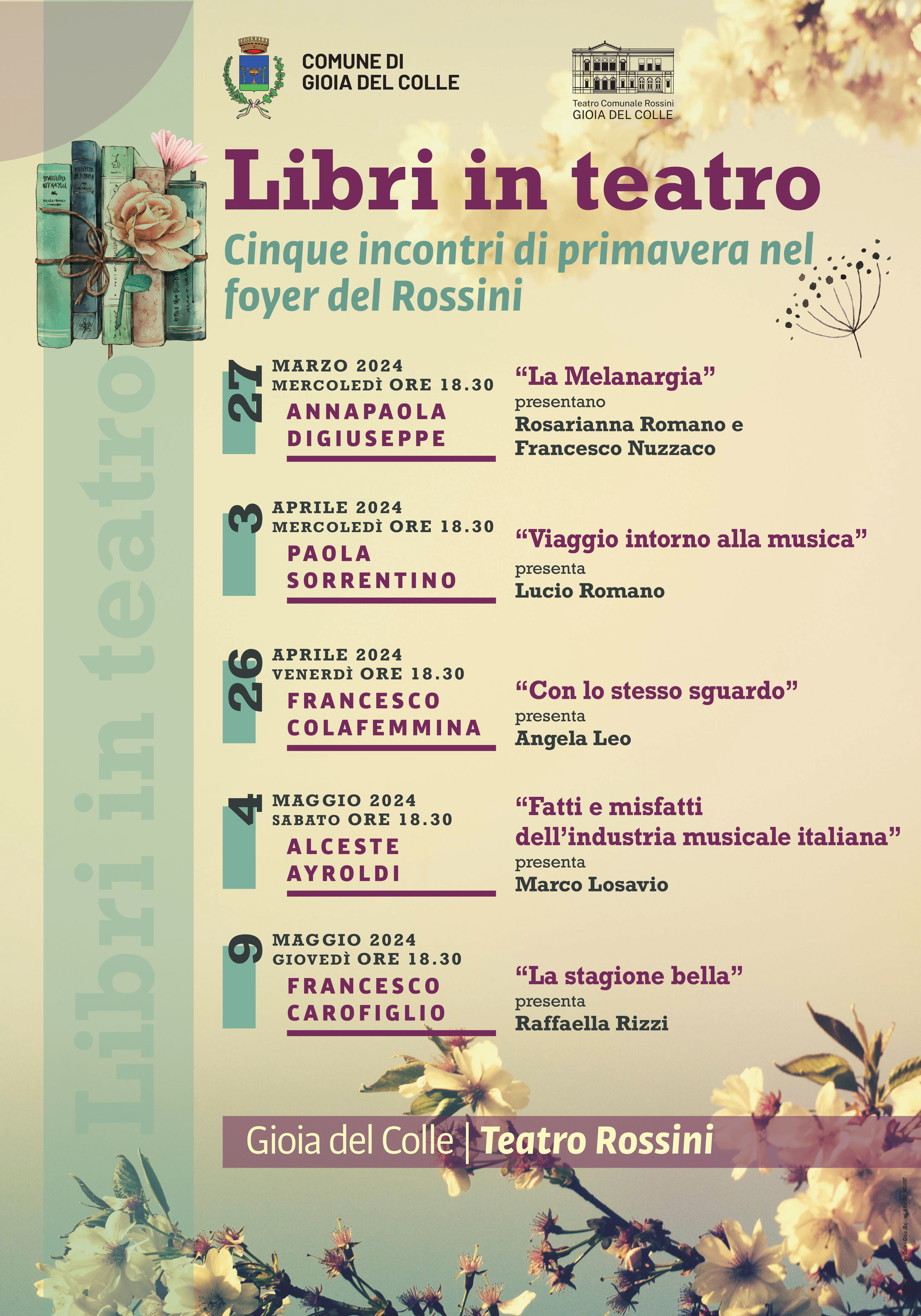 Il comune di Gioia del Colle dà il benvenuto alla primavera con la rassegna "Libri in teatro", nuova iniziativa dell'assessorato alla Cultura che, nei mesi di marzo, aprile e maggio, si articolerà in cinque incontri serali (tutti in programma alle ore 18:30) con autori nel foyer superiore del teatro comunale Rossini.
