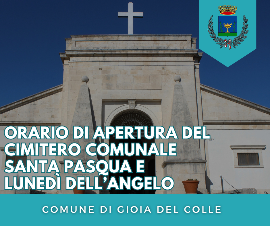 Si informa la cittadinanza che, in occasione delle ricorrenze della Santa Pasqua (31 marzo 2024) e del Lunedì dell’Angelo (1 aprile 2024), il cimitero comunale sarà aperto al pubblico dalle ore 7:30 alle ore 13:00.