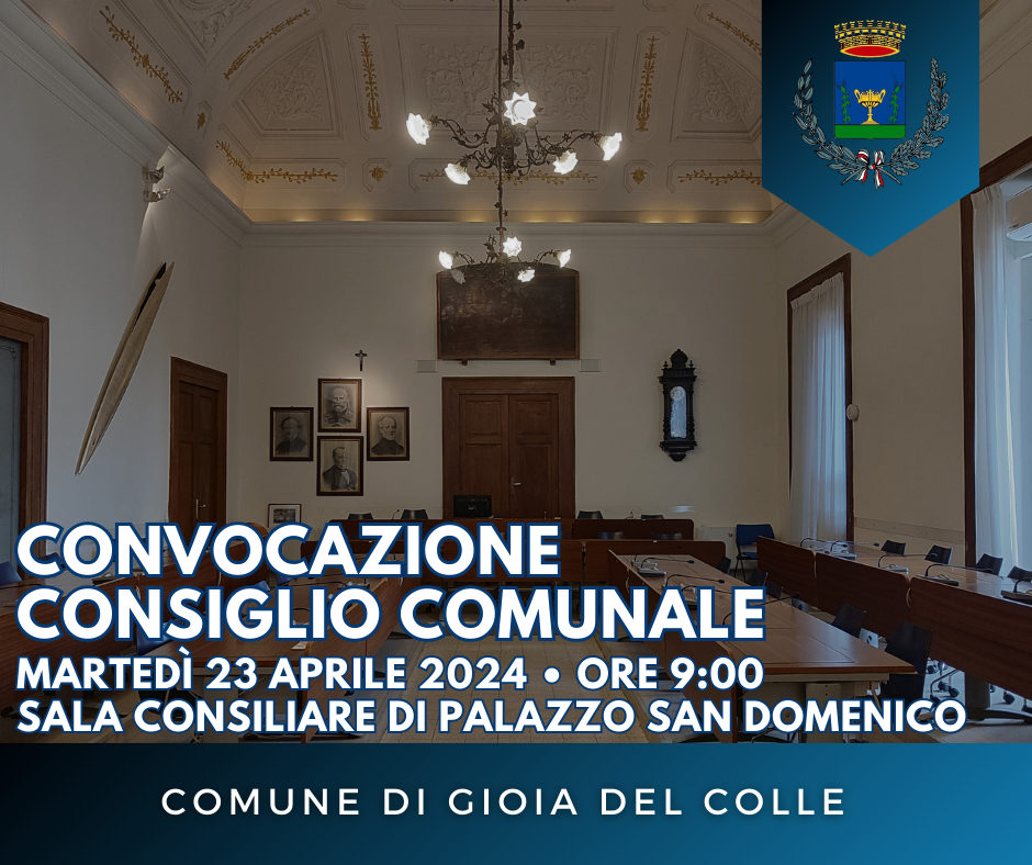 il Consiglio comunale di Gioia del Colle in seduta straordinaria ed in 1^ convocazione per il giorno 23 aprile 2024, alle ore 9:00 e, nel caso non si raggiunga il numero legale, in 2^ convocazione per il giorno 24 aprile 2024, alle ore 10:00, nella sala consiliare di Palazzo San Domenico, per la trattazione dei seguenti argomenti: