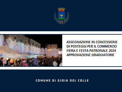 Con Determinazione del Responsabile dell'Area Urbanistica - Suap n. 473 del 23 aprile 2024 sono state approvate le graduatorie definitive per l'assegnazione in concessione di posteggi per la partecipazione alla Fiera di San Filippo Neri del 19 maggio 2024 e Festa Patronale di San Filippo Neri del 25 – 26 - 27 maggio 2024.