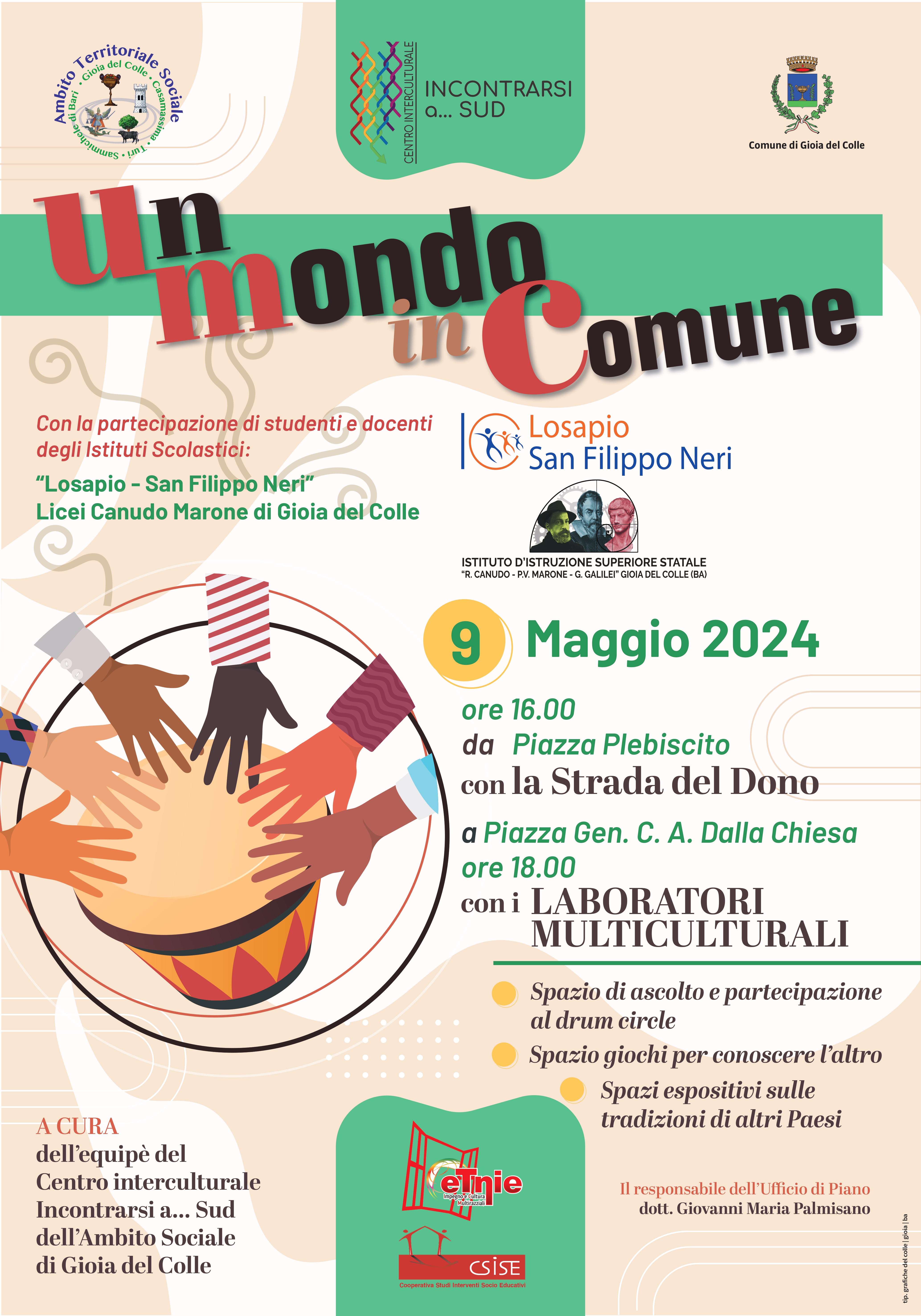 Sarà l’evento “Un mondo in Comune”, in programma giovedì 9 maggio, a segnare la conclusione del progetto “Drum n culture” che, organizzato dal Centro Interculturale “Incontrarsi a...Sud” dell’Ambito territoriale sociale di Gioia del Colle, da dicembre 2023 ad aprile 2024 ha coinvolto insegnanti, studentesse e studenti dell’IC “Losapio-San Filippo Neri”, del Liceo Scientifico “Ricciotto Canudo” e del Liceo Classico “Publio Virgilio Marone” in laboratori multiculturali per minori.