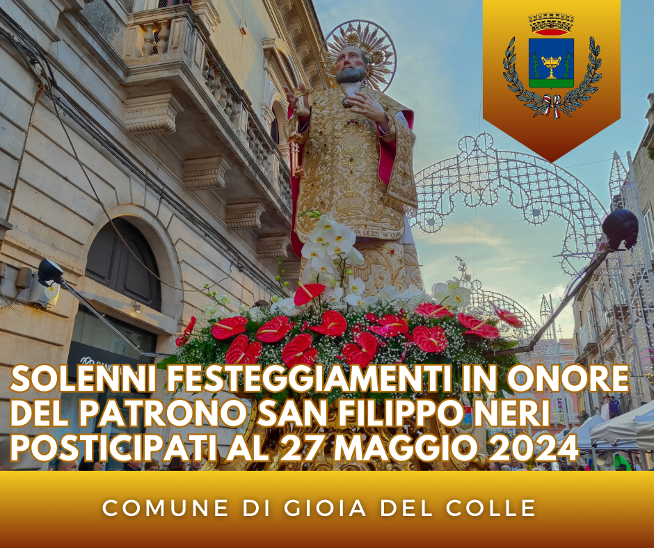 A seguito della nota pervenuta dal Comitato Feste Patronali di Gioia del Colle il 29 aprile 2024, si comunica che i festeggiamenti civili e religiosi in onore del patrono san Filippo Neri sono posticipati a lunedì 27 maggio 2024 per la concomitanza con la solennità liturgica della SS. Trinità.