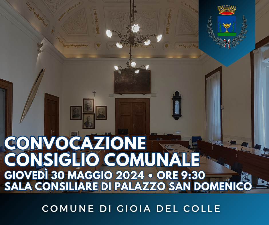 il Consiglio comunale di Gioia del Colle in seduta ordinaria ed in 1^ convocazione per il giorno 30 maggio 2024, alle ore 9:30 e, nel caso non si raggiunga il numero legale, in 2^ convocazione per il giorno 31 maggio 2024, alle ore 10:30, nella sala consiliare di Palazzo San Domenico, per la trattazione dei seguenti argomenti: