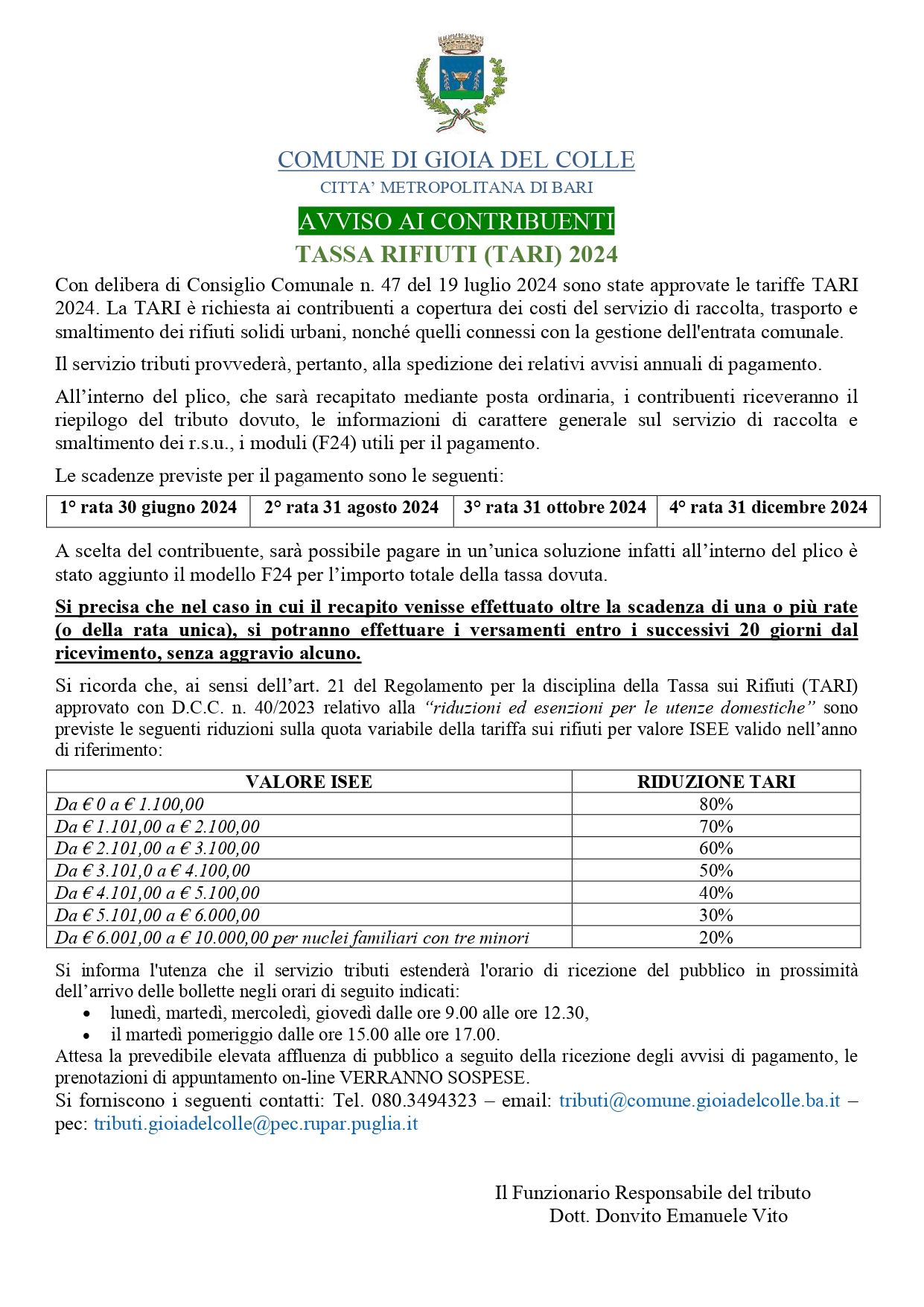 AVVISO AI CONTRIBUENTI - TASSA RIFIUTI (TARI) 2024