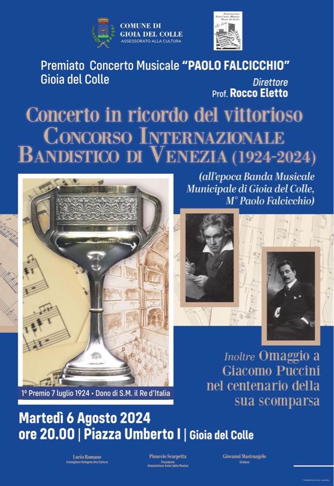 Martedi 6 Agosto alle ore 20:00 in Piazza Umberto a Gioia del Colle, il premiato concerto bandistico "Paolo Falcicchio" di Gioia del Colle eseguirà brani in ricordo del vittorioso concorso internazionale bandistico di Venezia.