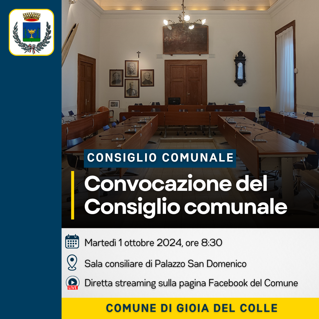 il Consiglio comunale di Gioia del Colle in seduta straordinaria ed in 1^ convocazione per il giorno 1 ottobre 2024, alle ore 8:30 e, nel caso non si raggiunga il numero legale, in 2^ convocazione per il giorno 2 ottobre 2024, alle ore 9:30, nella sala consiliare di Palazzo San Domenico, per la trattazione dei seguenti argomenti: