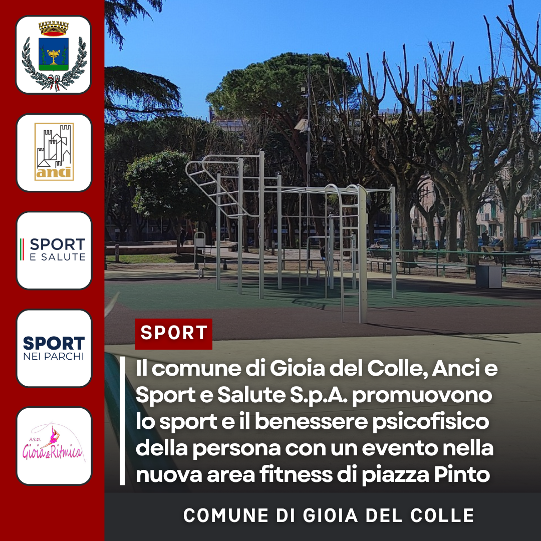 Aderendo al progetto “Sport di TUTTI – Parchi”, ideato da Sport e Salute S.p.A. (la società dello Stato per la promozione dello sport e dei sani stili di vita) e promosso assieme ad ANCI (Associazione Nazionale Comuni d’Italia), il comune di Gioia del Colle si conferma attento al benessere e alla salute dei propri cittadini e costantemente impegnato nell’incentivare il wellness nei giardini, nei parchi e nelle aree urbane.