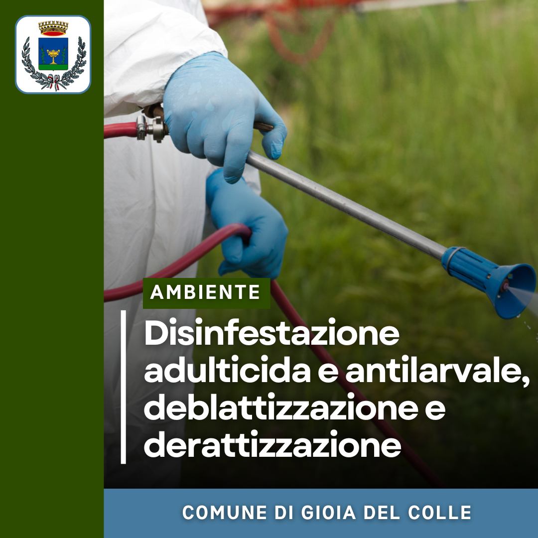 Mercoledì 23 ottobre 2024, sull'intero territorio comunale, saranno eseguiti gli interventi di deblattizzazione e derattizzazione e, a partire dalle ore 23:30, di disinfestazione adulticida e antilarvale.