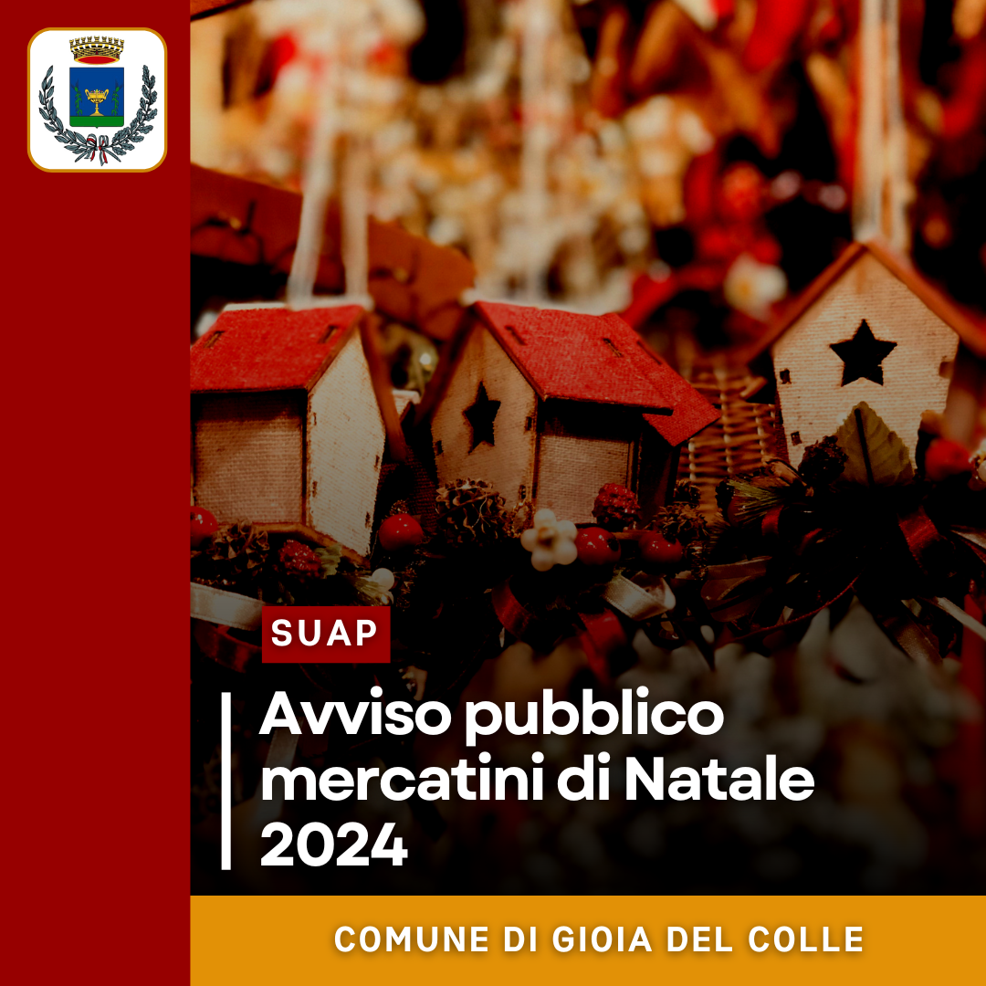 Si informano gli operatori commerciali interessati che, per l’anno 2024, i tradizionali “MERCATINI DI NATALE”, come previsto dal “PIANO COMUNALE DEL COMMERCIO SU AREE PUBBLCHE” approvato con deliberazione del Consiglio Comunale n. 37/2021, si svolgeranno in via Ricciotto Canudo nelle seguenti domeniche: 01 - 08 - 15 - 22 dicembre secondo le modalità organizzative proposte dall’Associazione di categoria U.P.S.A. Confartigianato di Gioia del Colle con nota n. prot. 30143/2024;