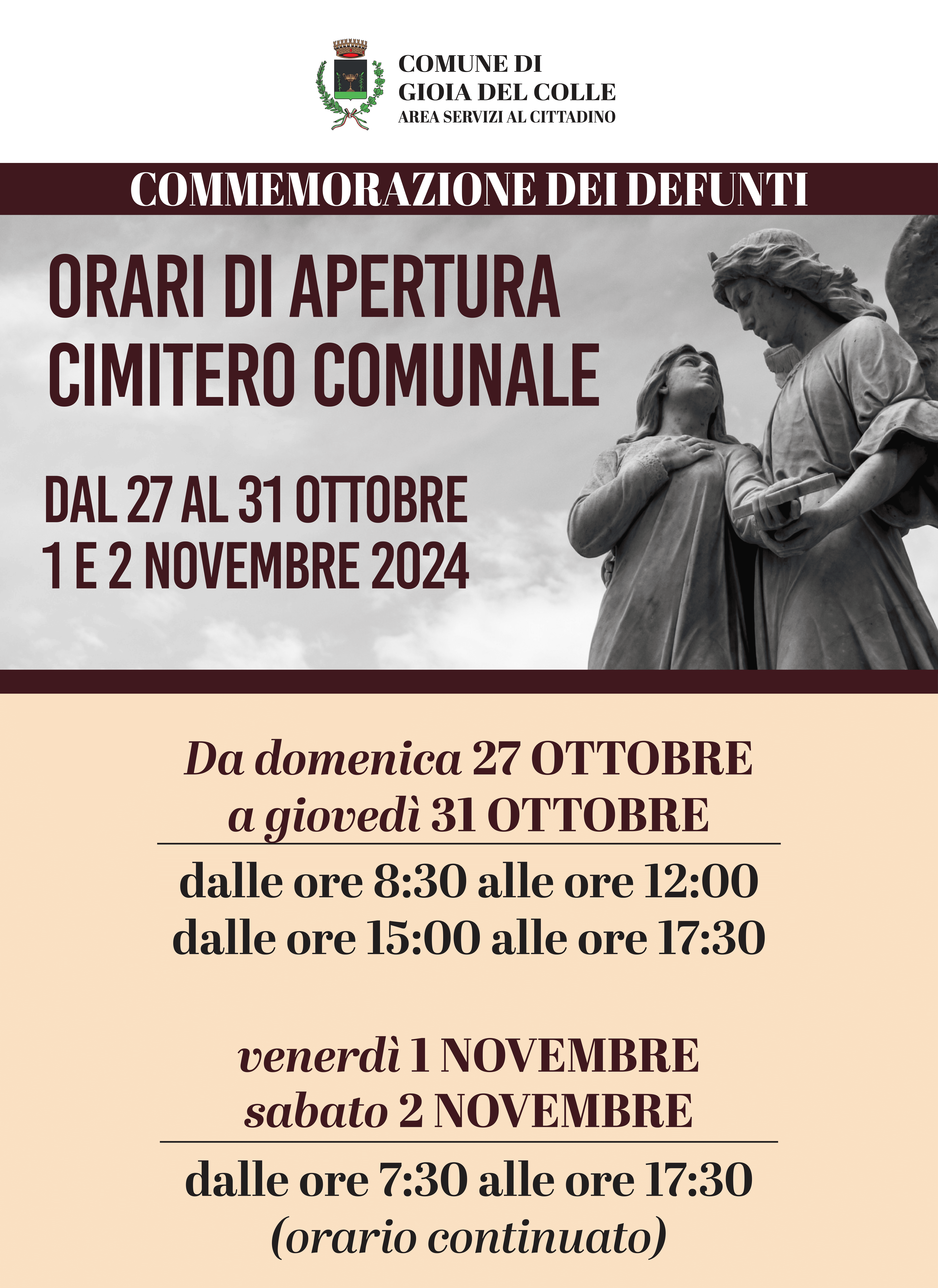 Si informa la cittadinanza che, in occasione della ricorrenza della commemorazione dei defunti, il cimitero comunale osserverà i seguenti orari di apertura: