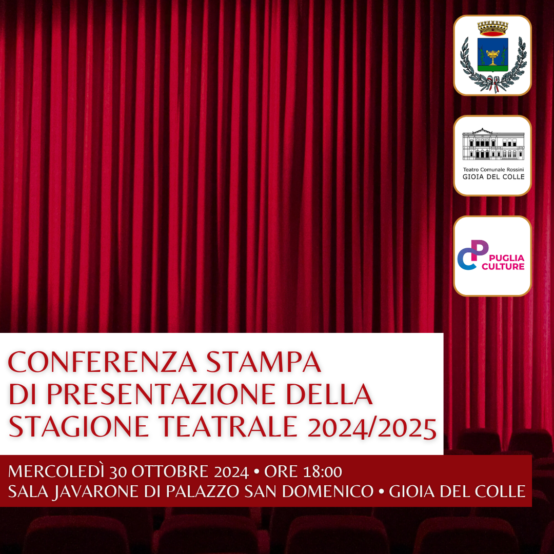 Mercoledì 30 ottobre 2024, alle ore 18:00, nella sala Javarone di Palazzo San Domenico sarà presentata la stagione 2024/2025 del Teatro Rossini, realizzata dal comune di Gioia del Colle in collaborazione con Puglia Culture.