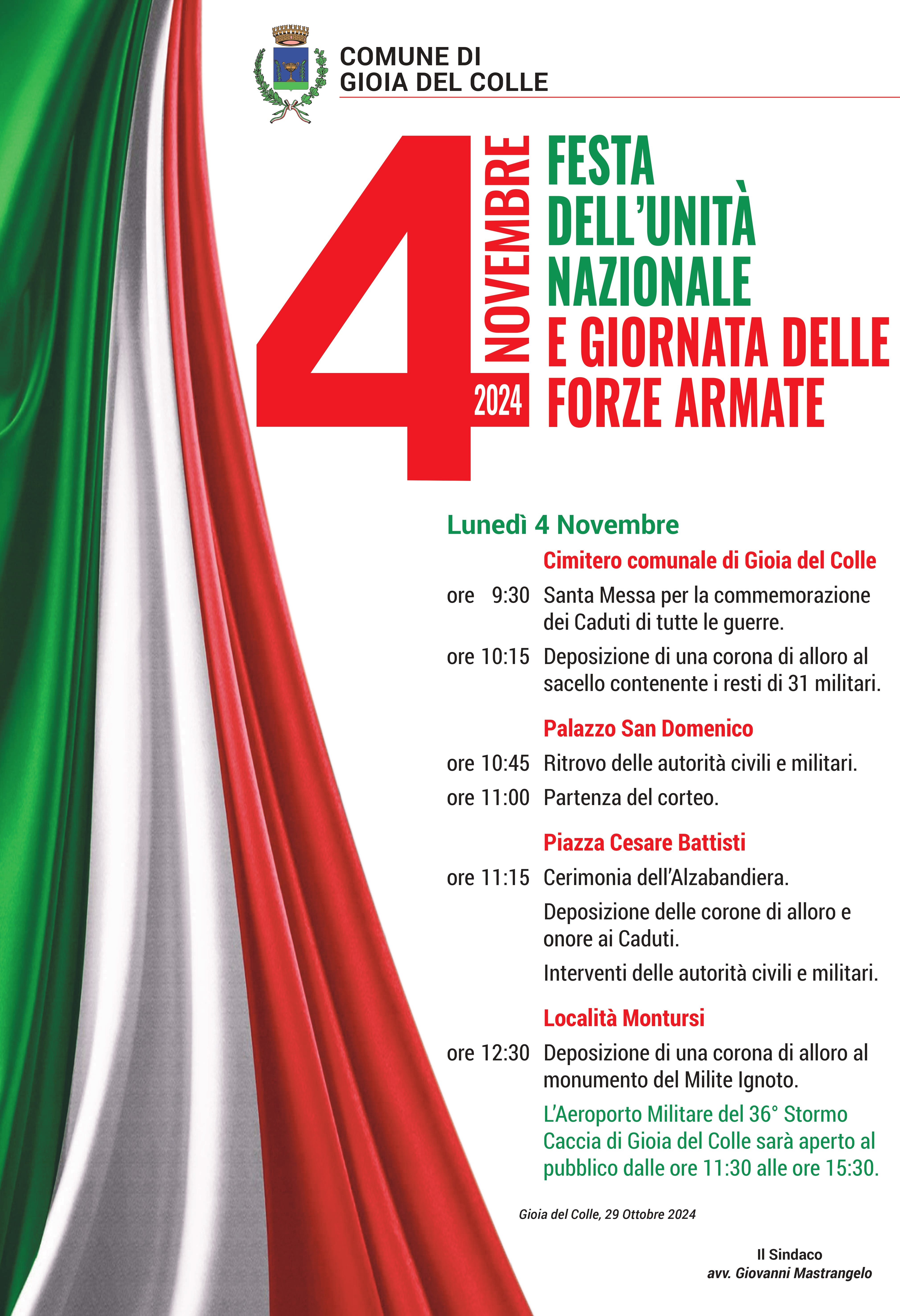 Alla presenza di associazioni d'arma e di volontariato e di una rappresentanza degli istituti scolastici gioiesi, a partire dalle ore 11:15, in piazza Cesare Battisti si terranno la cerimonia dell’Alzabandiera e la deposizione delle corone di alloro al Monumento ai Caduti, a cui seguiranno gli interventi delle autorità civili e militari.
