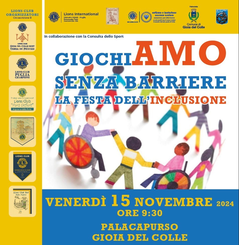 Domani, venerdì 15 novembre 2024, a partire dalle ore 9:30, al PalaCapurso si terrà una nuova edizione di "GiochiAmo senza barriere: la festa dell'inclusione", service riproposto anche quest'anno dal Lions Club Gioia del Colle Host Terra dei Peucezi insieme ai Lions Club della circoscrizione B con la finalità di promuovere l'inclusione e il benessere delle persone con disabilità.