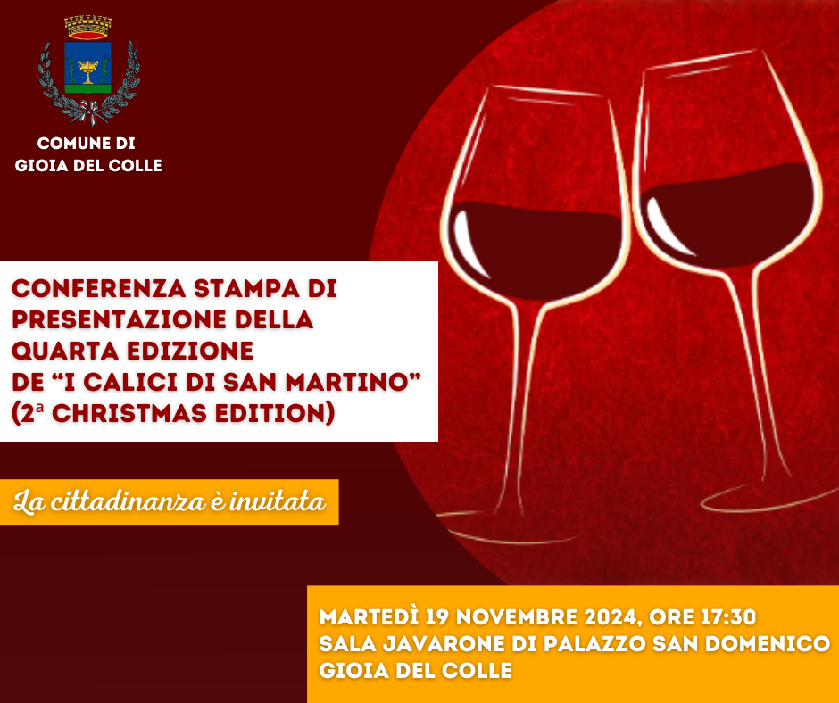 Martedì 19 novembre 2024, alle ore 17:30, nella sala Javarone di Palazzo San Domenico sarà presentata la quarta edizione de “I calici di San Martino” (2ª Christmas edition) che, in programma nelle serate del 6 e 7 dicembre 2024 nel centro storico di Gioia del Colle, è organizzata dall’amministrazione comunale al fine di promuovere e valorizzare le eccellenze enogastronomiche del territorio.