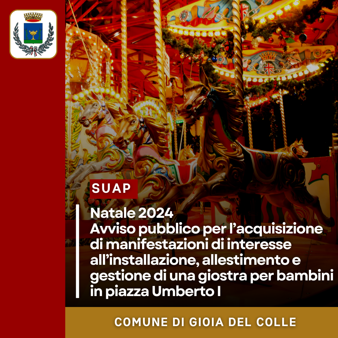 Con Determinazione del Responsabile dell'Area Urbanistica/Suap n. 1372 del 20.11.2024 è stato approvato l'Avviso pubblico per l’individuazione di un operatore cui affidare l’installazione, l’allestimento e la gestione, in Piazza Umberto I, di una giostrina per bambini a tema natalizio nel periodo intercorrente tra il 06/12/2024 ed il 07/1/2025.