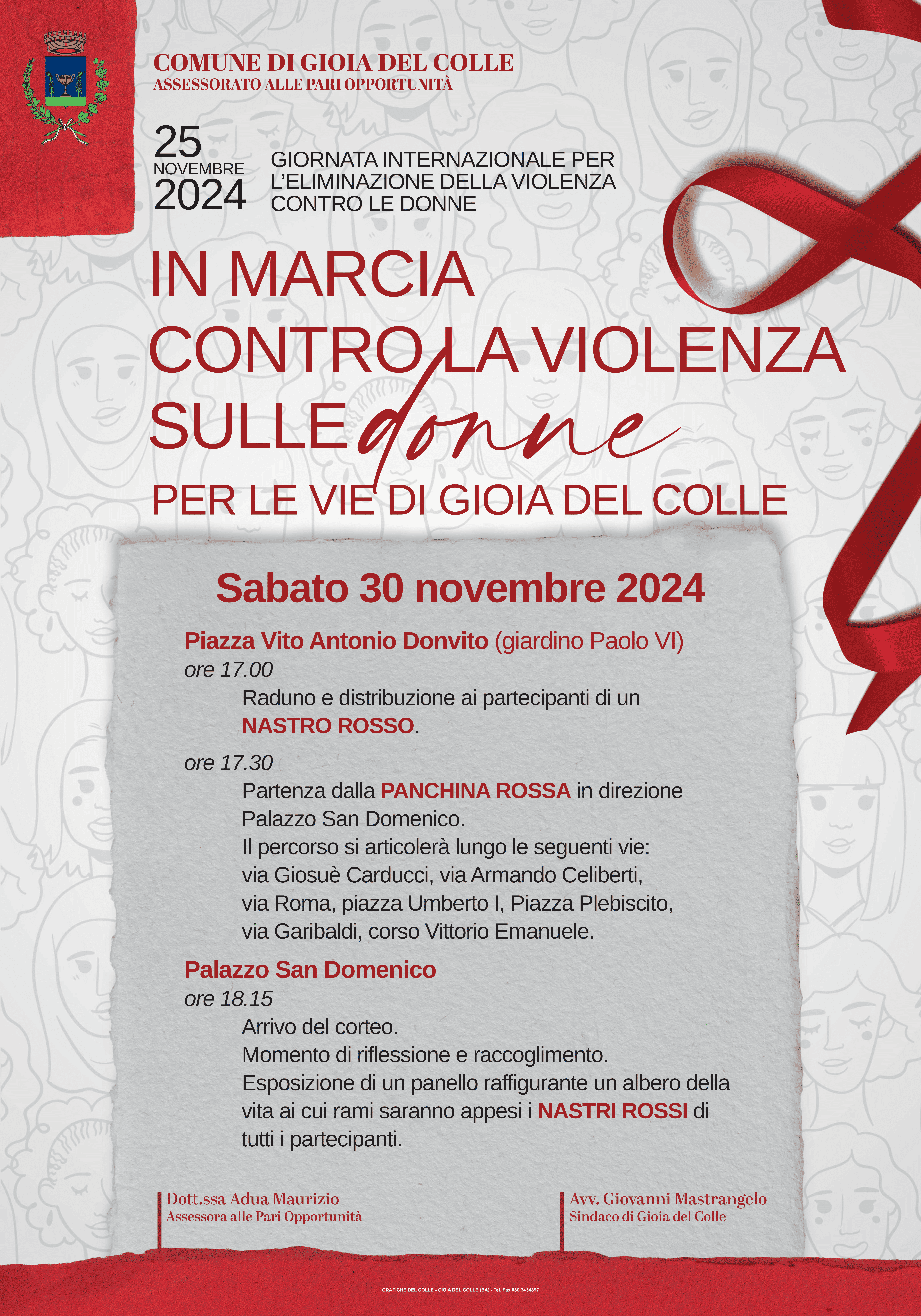 In occasione della Giornata internazionale per l’eliminazione della violenza contro le donne, l’amministrazione comunale di Gioia del Colle chiama a raccolta l’intera cittadinanza per la manifestazione che, organizzata e promossa dall’assessorato alle Pari Opportunità, si svolgerà sabato 30 novembre 2024 per le vie della città.
