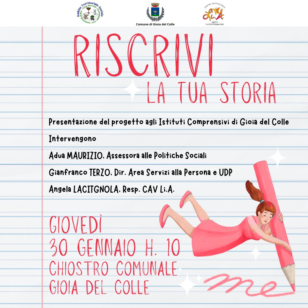 La scrittura come strumento di riflessione e partecipazione per sensibilizzare i più giovani alla prevenzione e al contrasto della violenza e delle discriminazioni di genere: è questo l’obiettivo di “Riscrivi la tua storia”, la nuova iniziativa dell’Ambito Territoriale Sociale di Gioia del Colle e del Centro Antiviolenza Li.A. che coinvolge i comuni di Gioia del Colle, Casamassima, Sammichele di Bari e Turi ed è rivolta alle scuole secondarie di primo grado.