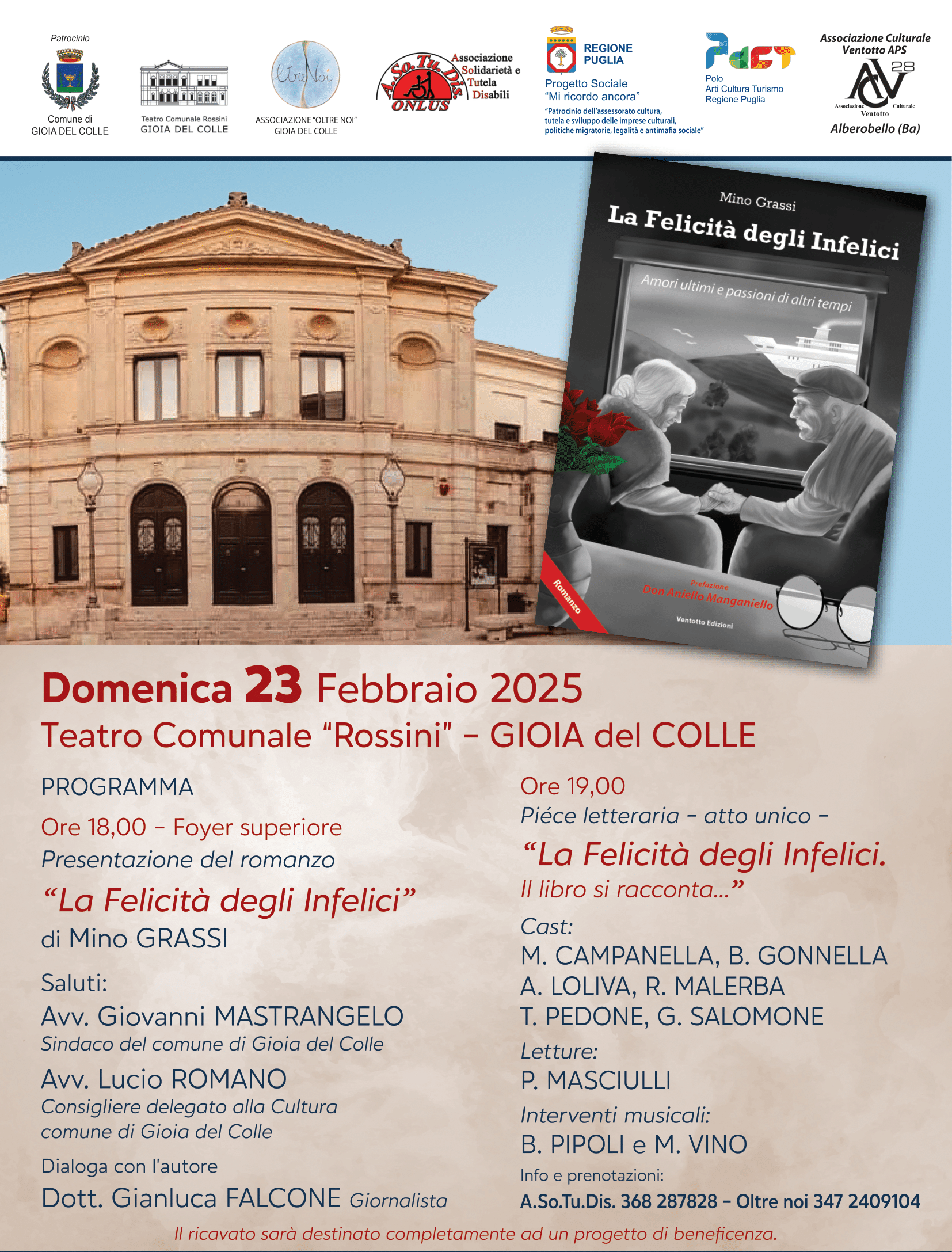 Gli eventuali contributi volontari raccolti in occasione della serata, promossa dall’associazione culturale Ventotto e patrocinata dal comune di Gioia del Colle, saranno interamente devoluti alle associazioni APS Oltre Noi e A.So.Tu.Dis. per la realizzazione di attività di carattere socio-culturale sul territorio.