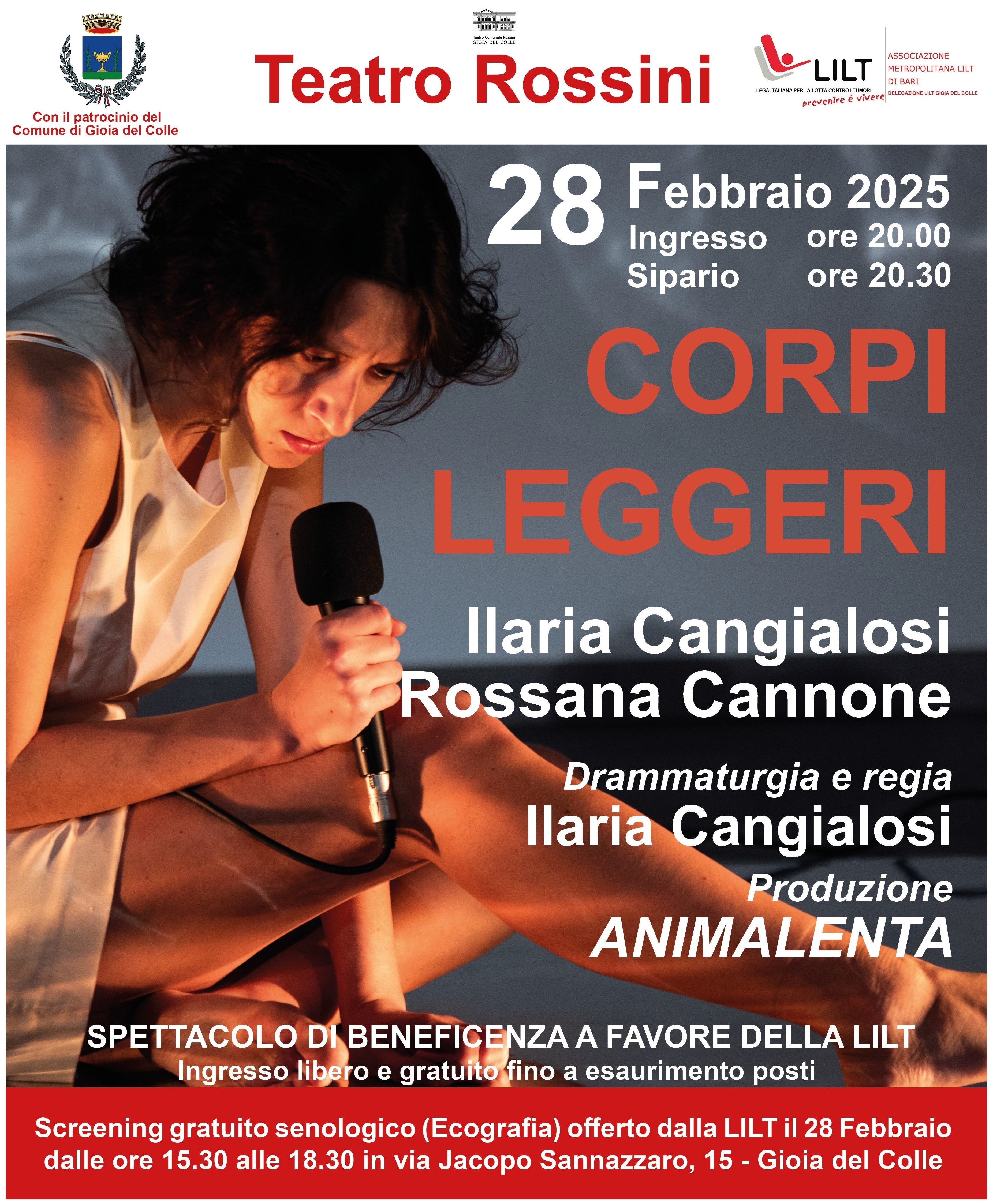 La pièce teatrale, che dalle ore 20:30 vedrà protagoniste sul palco sia Ilaria Cangialosi che Rossana Cannone, racconta l’esperienza della malattia e i suoi molteplici aspetti che sfociano nell’incredulità, nella paura, nello smarrimento fino alla perdita della propria identità, nell’accettazione, nella determinazione e nella rinascita.