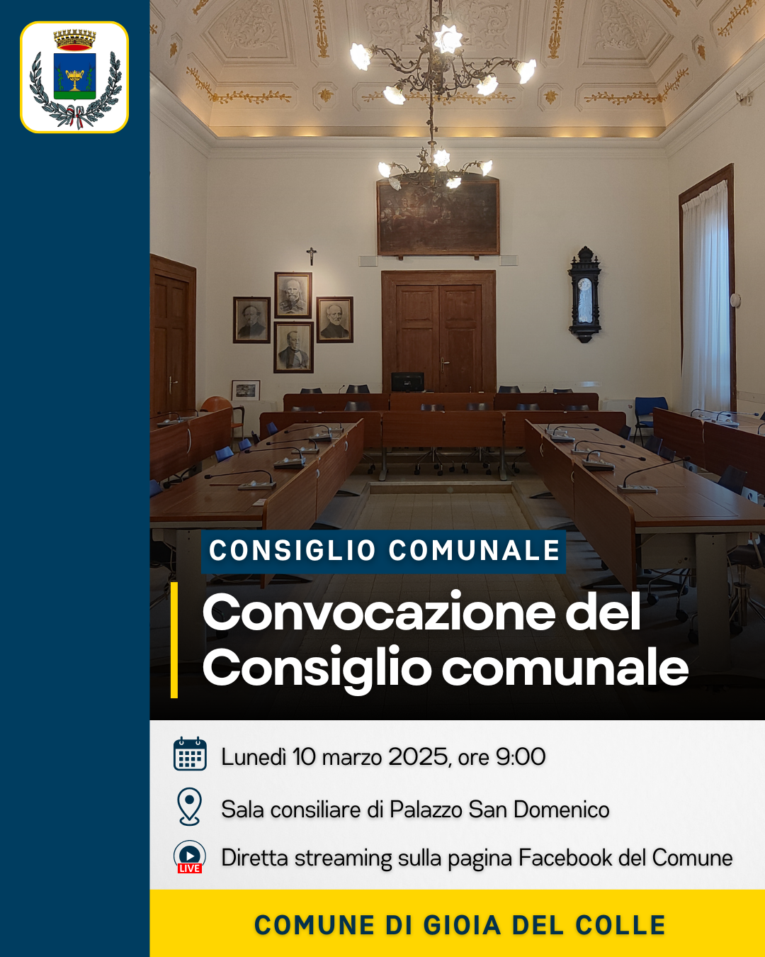 il Consiglio comunale di Gioia del Colle in seduta ordinaria e in 1^ convocazione per il giorno 10 marzo 2025, alle ore 9:00 e, nel caso non si raggiunga il numero legale, in 2^ convocazione per il giorno 11 marzo 2025, alle ore 10:00, nella sala consiliare di Palazzo San Domenico, per la trattazione dei seguenti punti all'ordine del giorno: