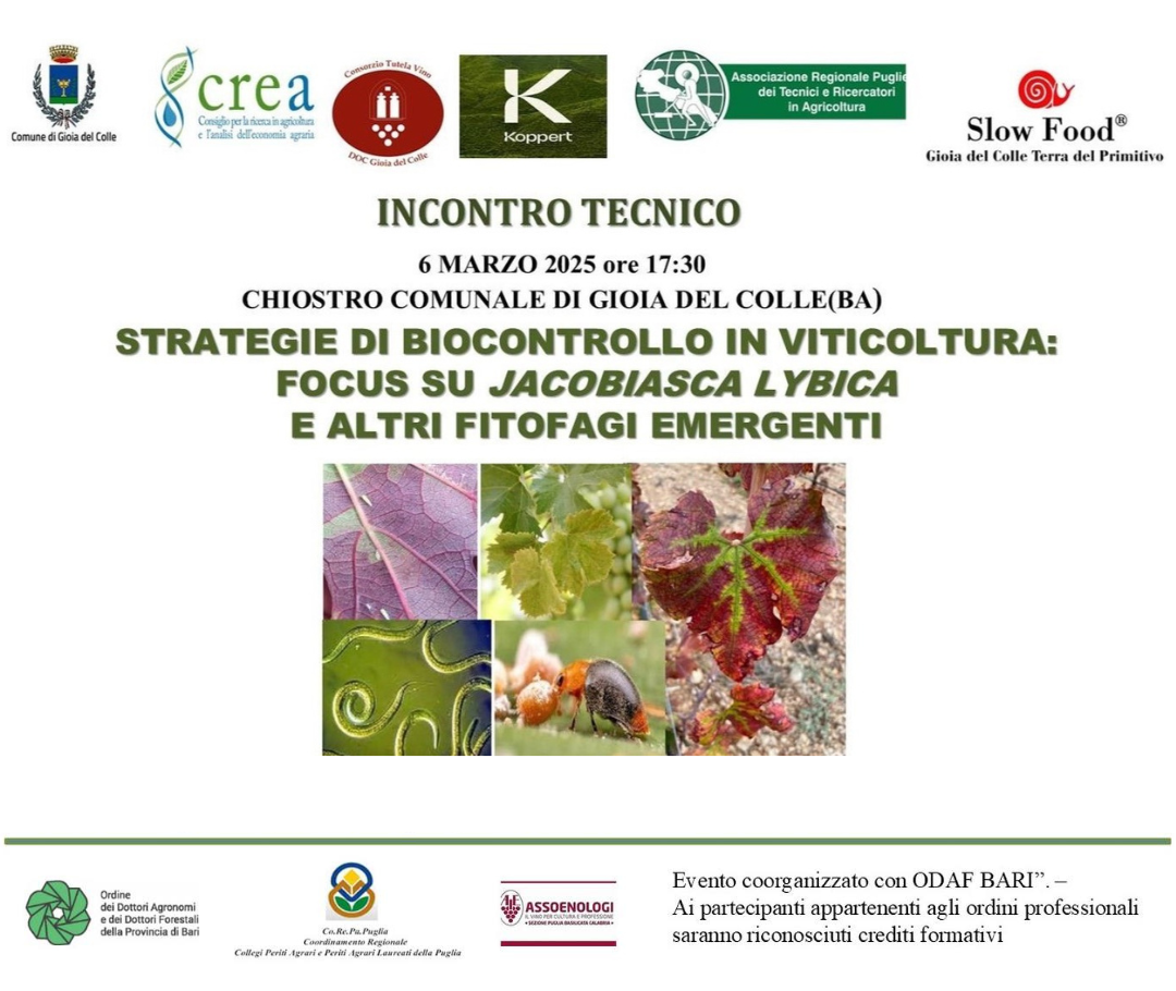 L’evento, promosso da Crea (Consiglio per la ricerca in agricoltura e l’analisi dell’economia agraria) e patrocinato dal Comune di Gioia del Colle, rappresenterà un’occasione di confronto e approfondimento sulle tematiche relative ai cambiamenti climatici, al biocontrollo in viticoltura e alla produzione di cibo sostenibile.
