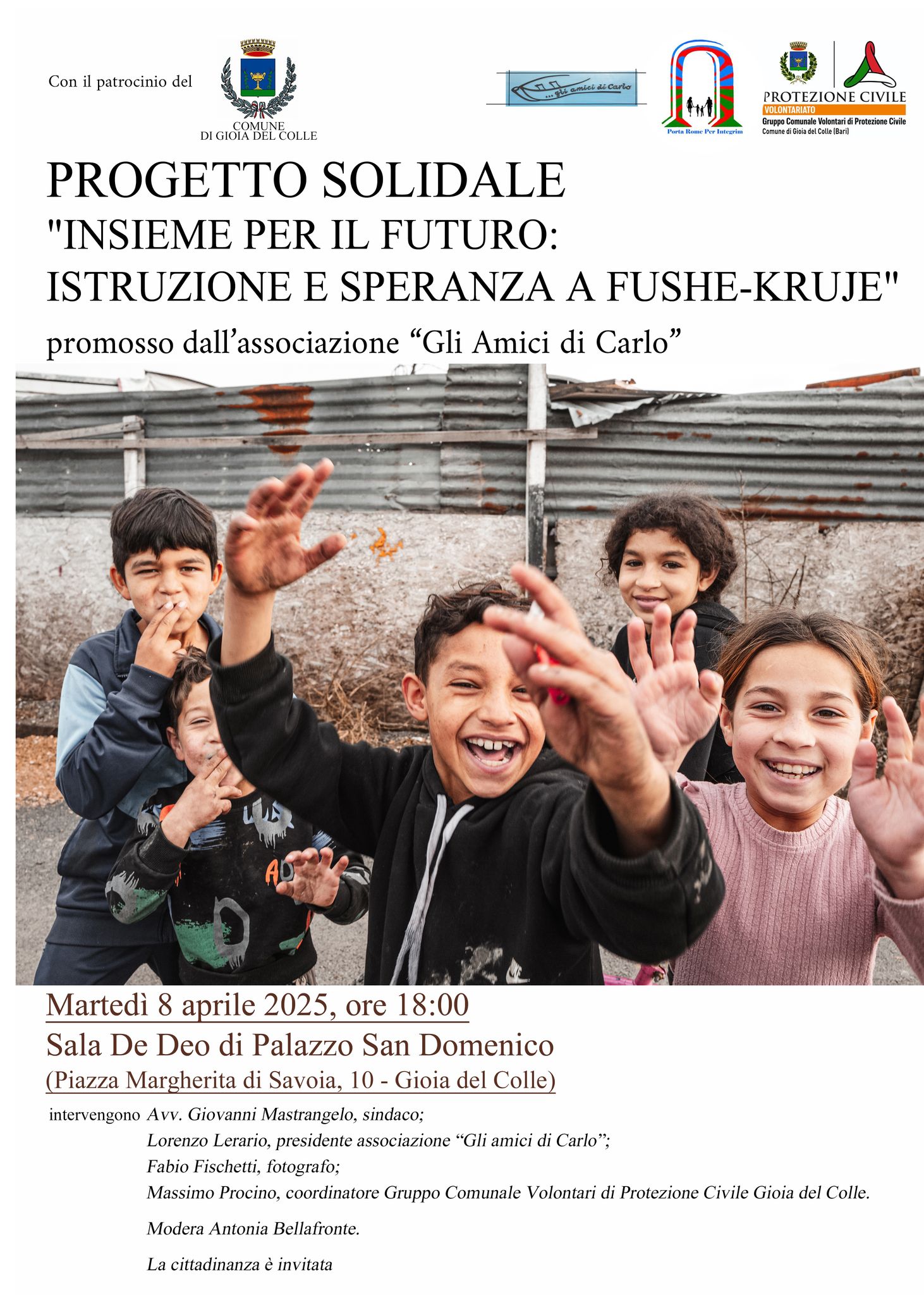 Martedì 8 aprile 2025, a partire dalle ore 18:00, nella sala De Deo di Palazzo San Domenico sarà presentato il progetto solidale “Insieme per il futuro: istruzione e speranza a Fushe-Kruje”, promosso dall’associazione “Gli Amici di Carlo” in collaborazione con l’ONG “Porta Rome për Integrim”.