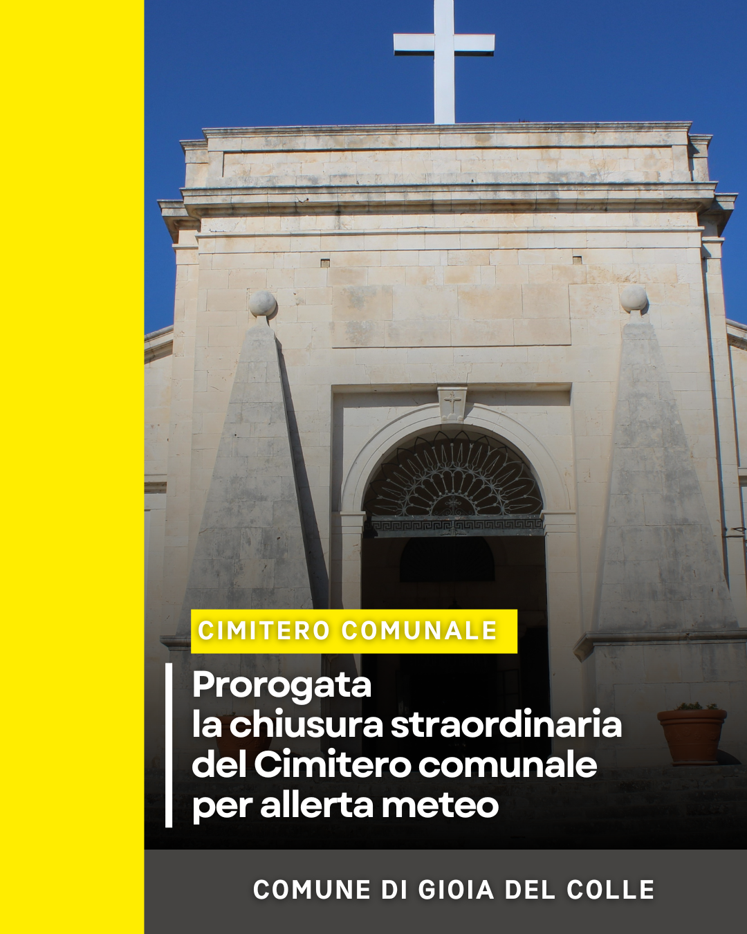 Si informa la cittadinanza che, a seguito del protrarsi dell'allerta meteo diramata dalla Sezione Protezione Civile della Regione Puglia, con ordinanza sindacale n. 56/2025 è stata prorogata la chiusura straordinaria del Cimitero comunale fino alle ore 16:00 di domani, giovedì 17 aprile 2025.