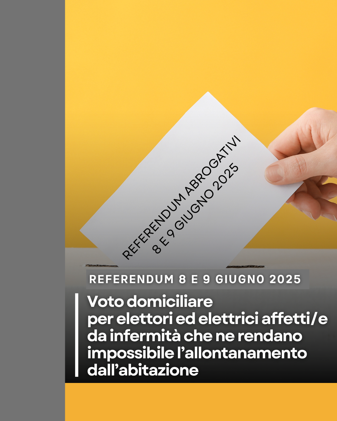 Si rende noto che, nell’ambito delle consultazioni referendarie, si applicano le disposizioni sul voto domiciliare (previste dall’art. 1 del decreto legge 3 gennaio 2006, n. 1, convertito dalla legge 27 gennaio 2006 n. 22, come modificato dalla legge 7 maggio 2009 n. 46) in favore di: