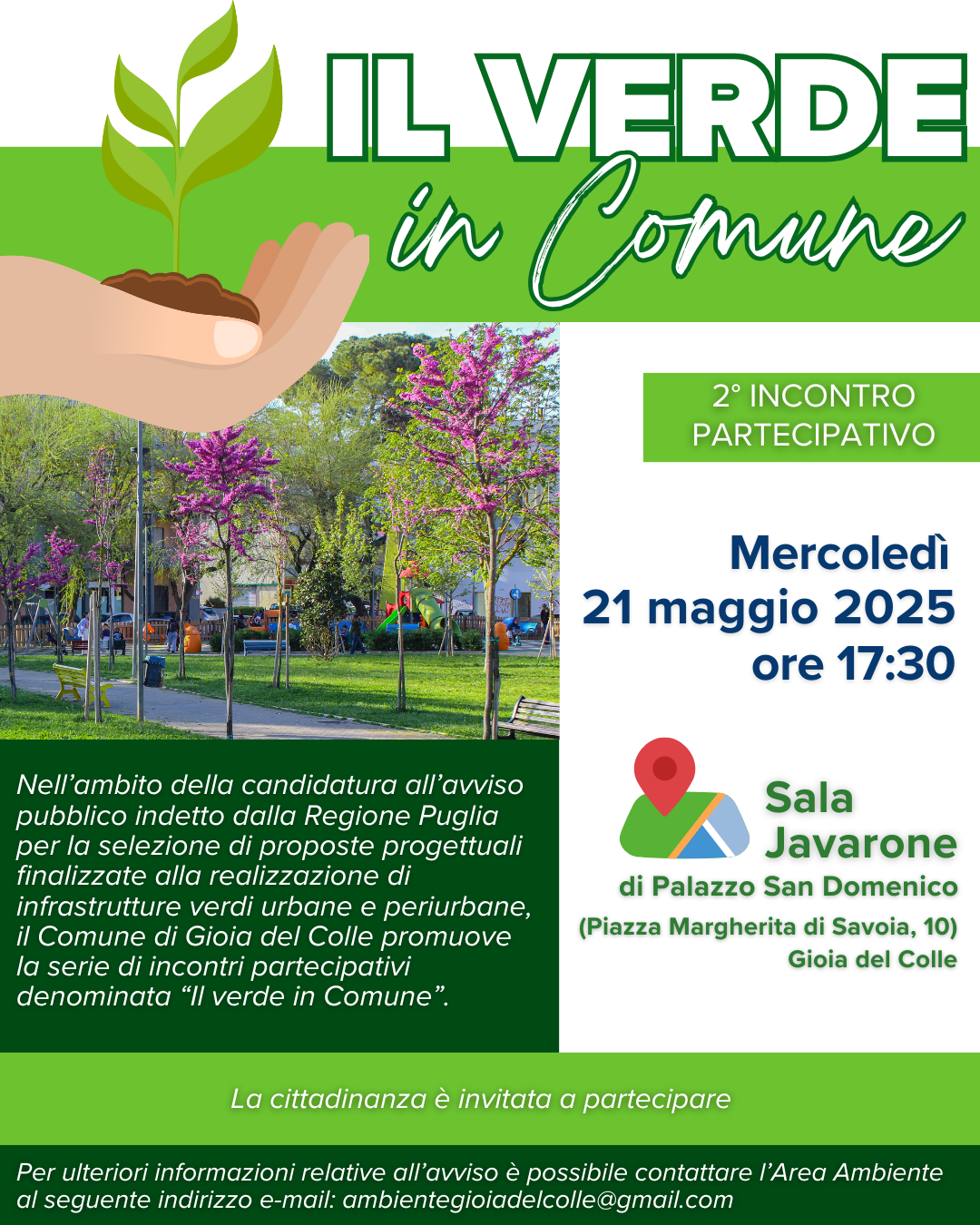 Prosegue la serie di incontri partecipativi promossa dal comune di Gioia del Colle nell’ambito della candidatura all’avviso pubblico indetto dalla Regione Puglia per la selezione di proposte progettuali finalizzate alla realizzazione di infrastrutture verdi urbane e periurbane.
